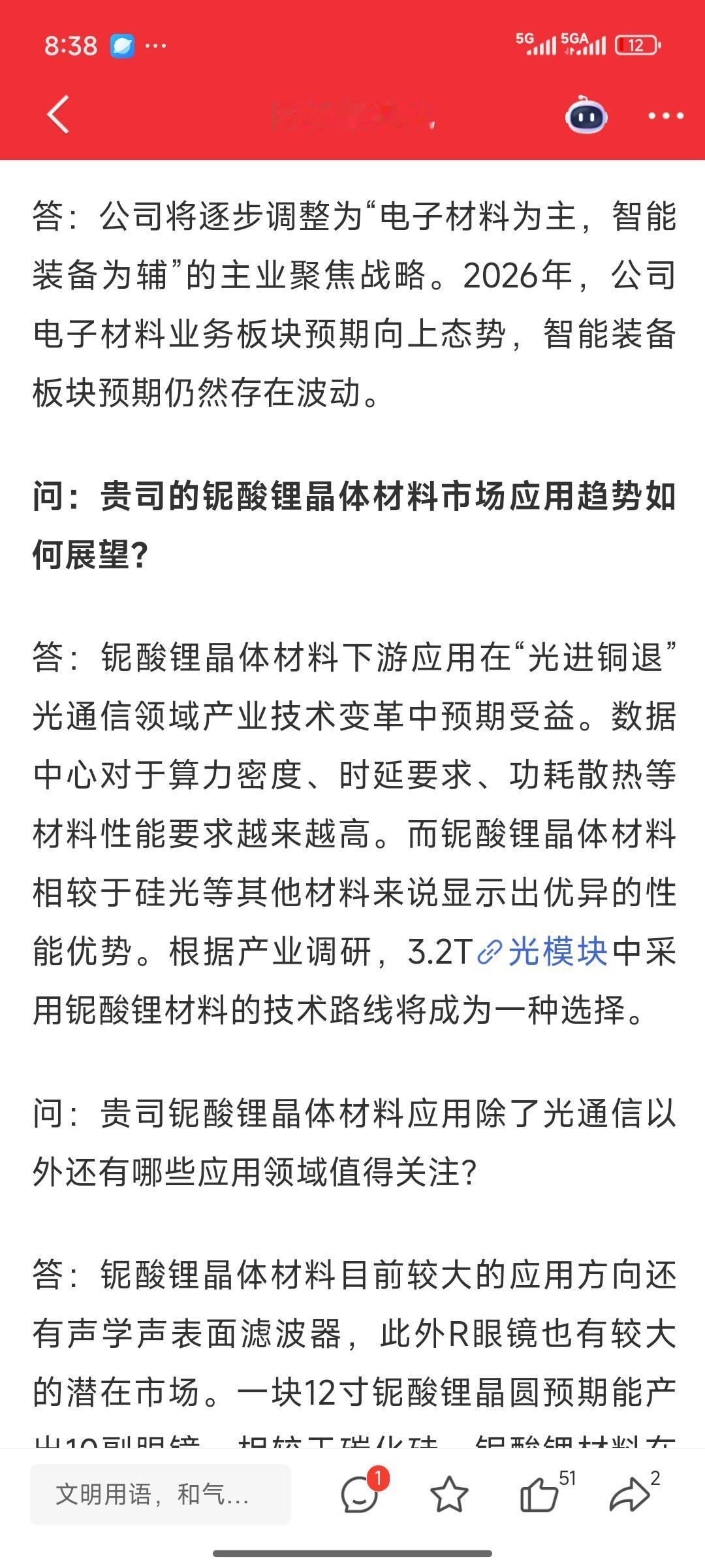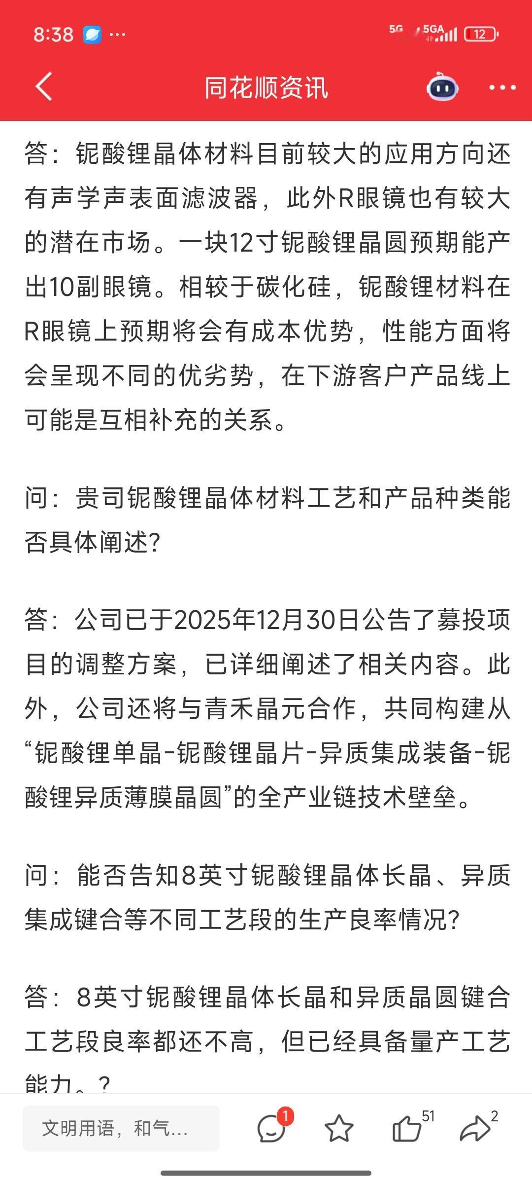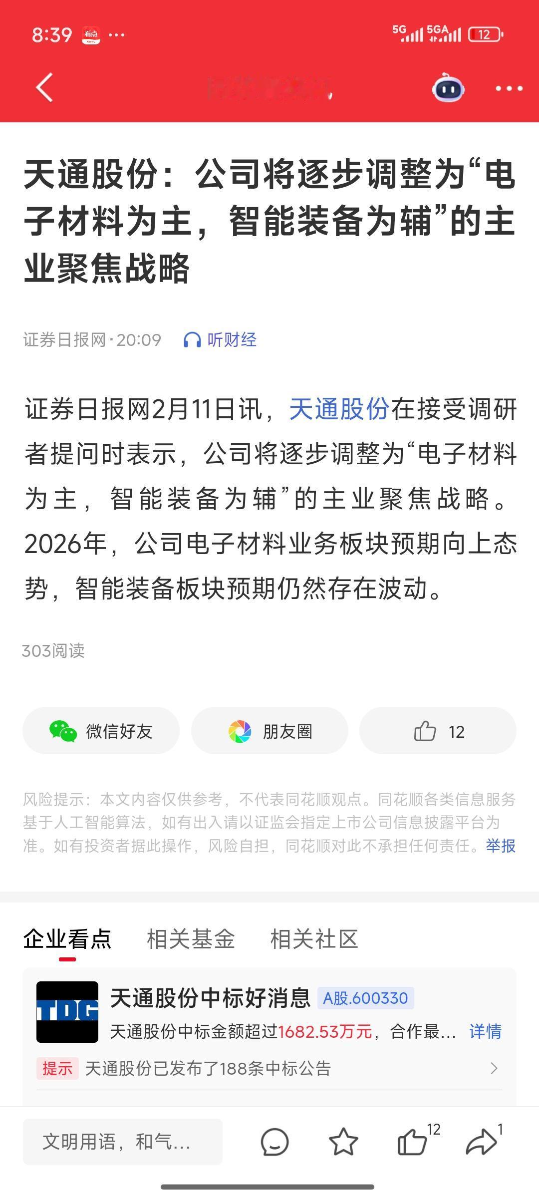 刚刚消息公布,天通股份接待了二十家证券公司的调研,针对几个核心问题作出解答,明确了以电子材料为主、智能装备为辅的发展方向。这对天通股份来说是中长期利好。因此我认为,明天天通股份大幅上涨的可能性很大,不排除反包涨停。我对天通股份2026年的股价表现愈发有信心了。