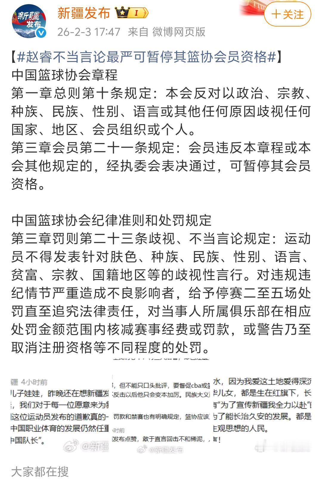 CBA终于对赵睿做出处罚了,因对新疆人民发表种族歧视言论被CBA公司停赛三场,罚款5万元。这样的处罚也是千呼万唤使出来,他的那句新疆人民没有主观思想不但在网上引发热议,还惊动了新疆政府,新疆政府官方微博发布动态表示:赵睿的言论微博CBA联赛纪律准则,应该做出停赛2-5场的处罚。 新疆官方微博说的有理有据,而CBA的处罚似乎也是姗姗来迟。要在2月1日,有球迷在赵睿的评论区留言:赵睿的巅峰在广东。 这本是一句平常的留言,但是却引发了赵睿,他更是把怒火放到了整个新疆上。赵睿回复:新疆边上待一待,自己人民都没有主观思想,被别人带着走。 赵睿这句话发出后,引发了轩然大波,新疆本是敏感地区,而赵睿的言论影响了民族团结,有分裂言论。 或许是在舆论和新疆官方的压力下,篮协才做出这份姗姗来迟的处罚。 赵睿是中国男篮队长,他有着很好的身体素质,但是在个人素质上确实是需要提高!