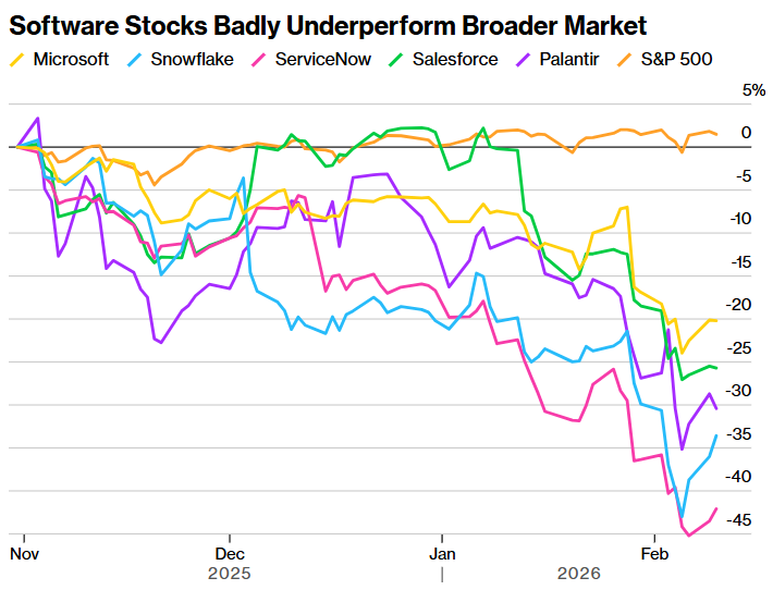 尽管笼罩在该行业的不确定性确实存在,但抛售潮如此之大,以至于许多原本被预期为长期赢家的公司也未能幸免。市场专家最常提及的公司包括:微软(MSFT.US)、Snowflake(SNOW.US)、ServiceNow(NOW.US)、赛富时(CRM.US)和PalantirTechnologies(PLTR.US)。