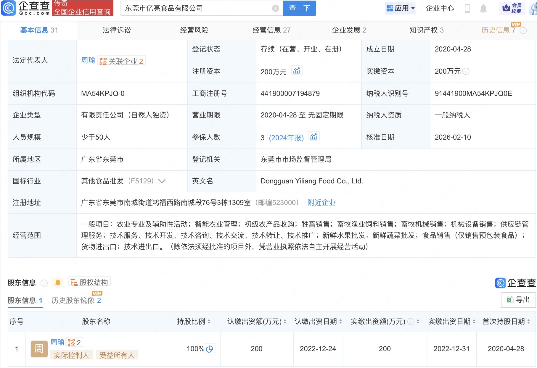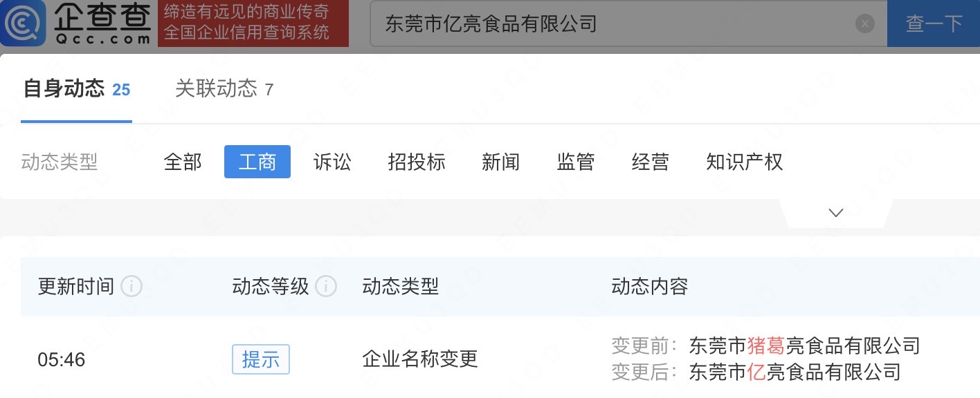 企查查APP显示,近日,东莞市猪葛亮食品有限公司发生工商变更,企业名称变更为东莞市亿亮食品有限公司。该公司成立于2020年,法定代表人为周瑜,经营范围包括智能农业管理、初级农产品收购等,由周瑜全资持股。