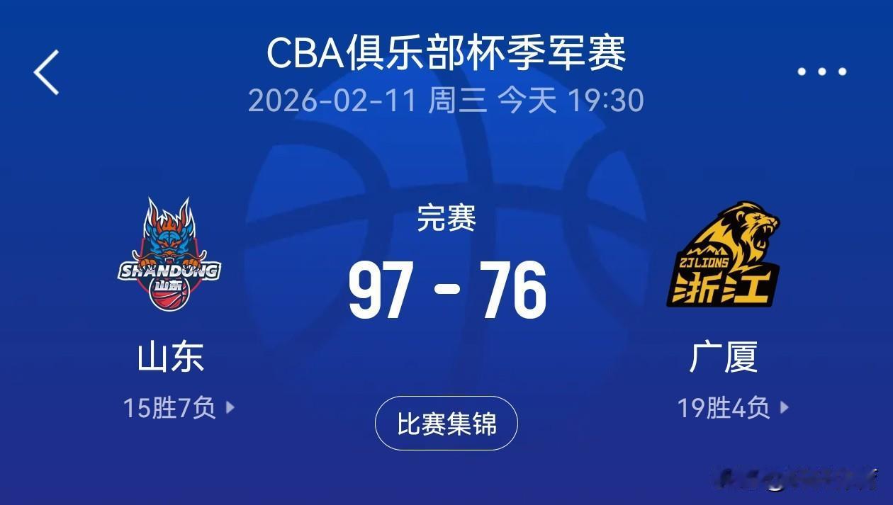 俱乐部杯赛山东新援琼斯首秀,17分14篮板4盖帽助球队97-76战胜广厦男篮,凭借本场比赛的胜利,山东男篮取得了本届杯赛的季军,残阵广厦获得第四名,本场比赛山东男篮5人得分上双,浙江广厦4人得分上双,其中塔克得到了全场最高的23分,另一名外援卡尔顿拿下了14分17篮板,本场比赛广厦男篮由于胡金秋等国手上调国家男篮集训队,孙铭徽上一场对阵山西以外受伤,导致本场比赛广厦仅有8人轮换,最终无心恋战的广厦仅获得本届杯赛的第四名。
