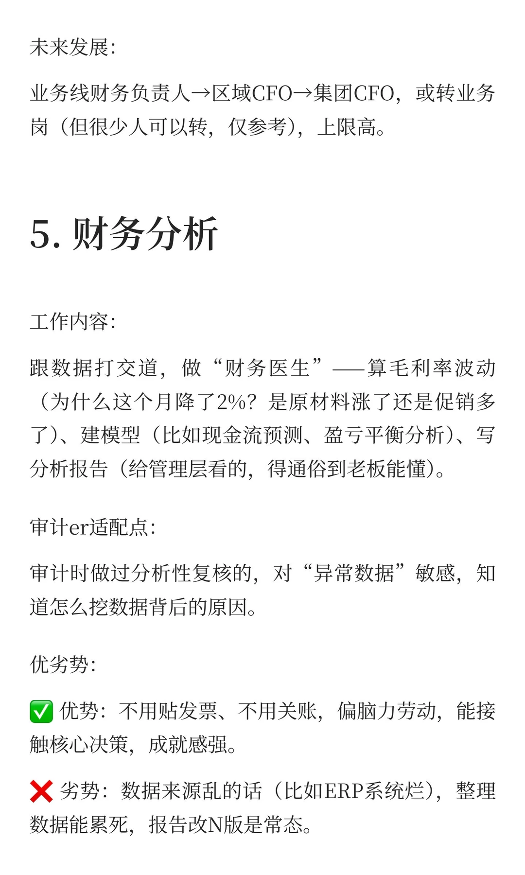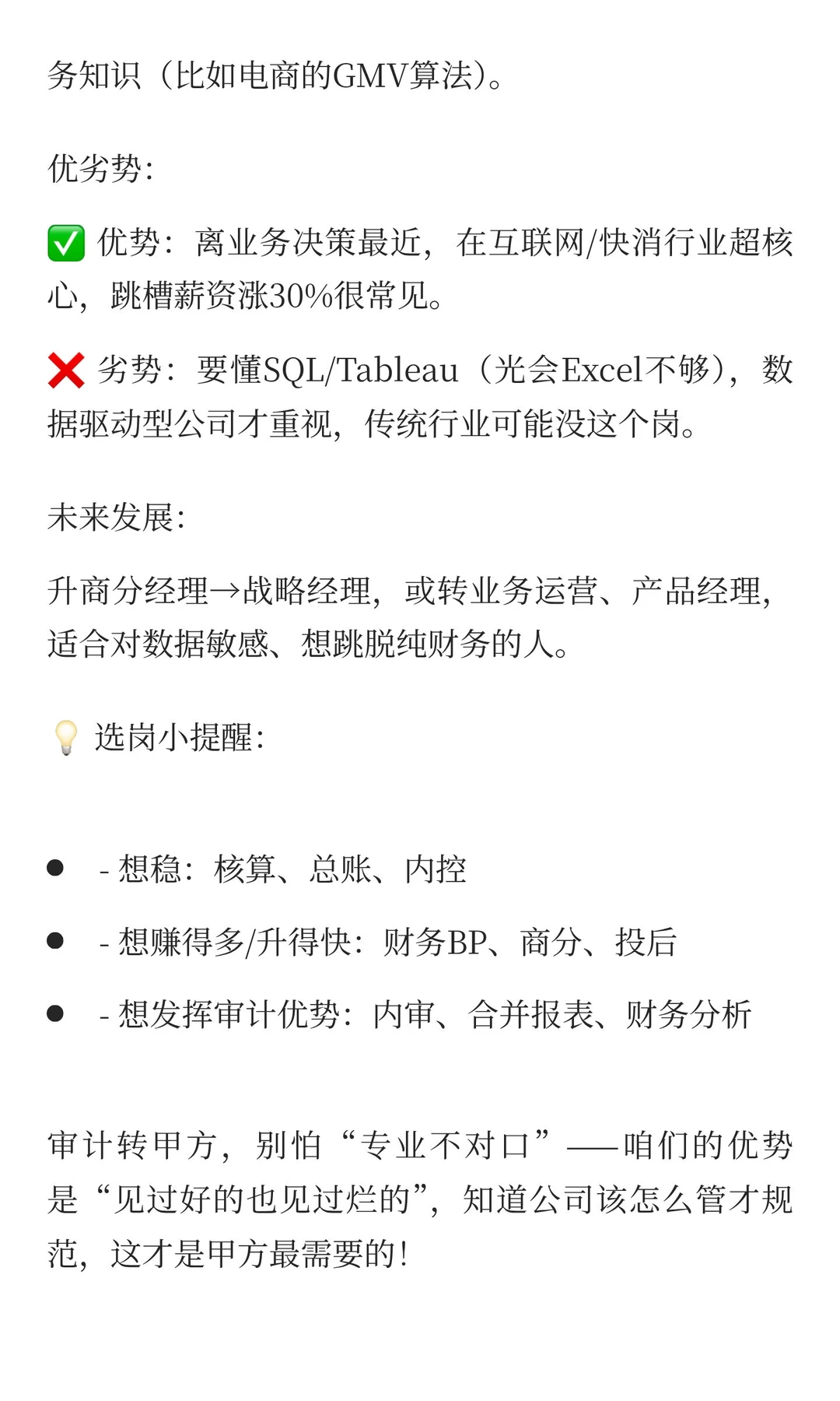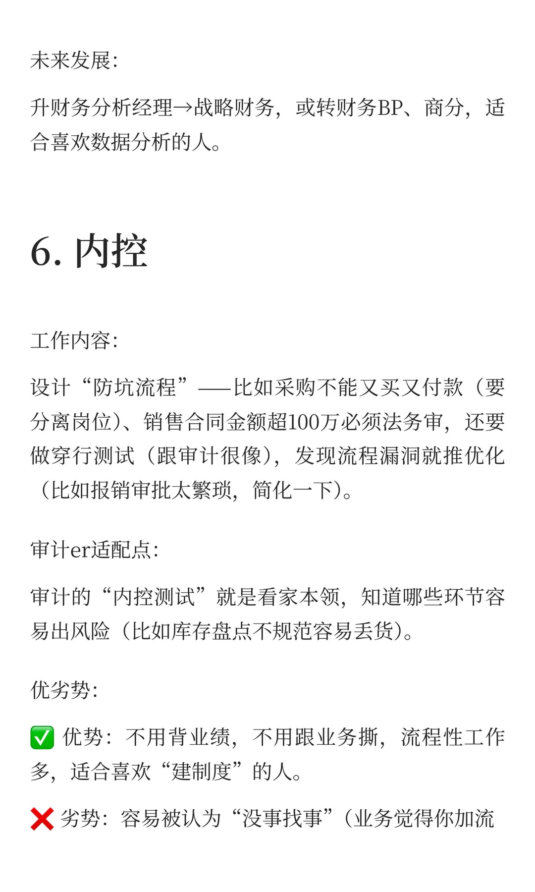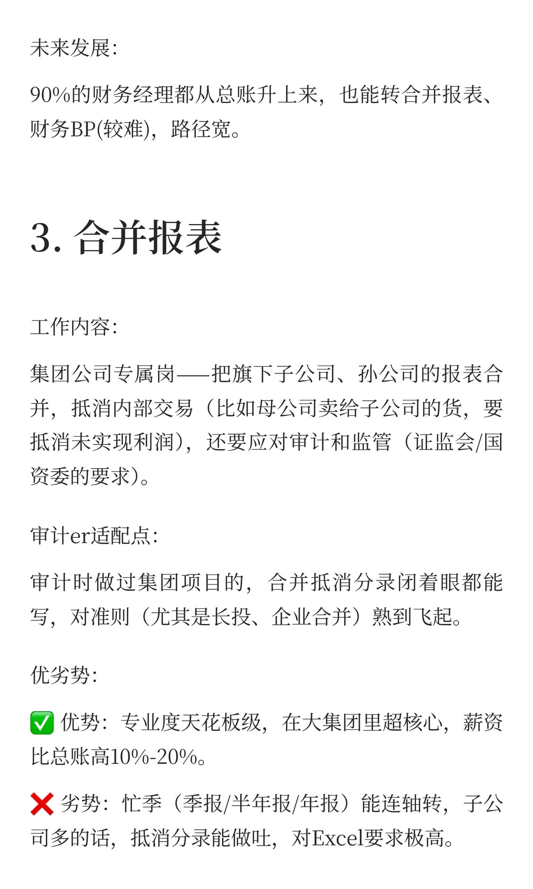 财务岗位包括核算、总账、合并报表、财务BP、财务分析、内控、内审、风控、投后、商业分析等,各有优劣势和发展路径,我们均有学员辅导上岸经验。