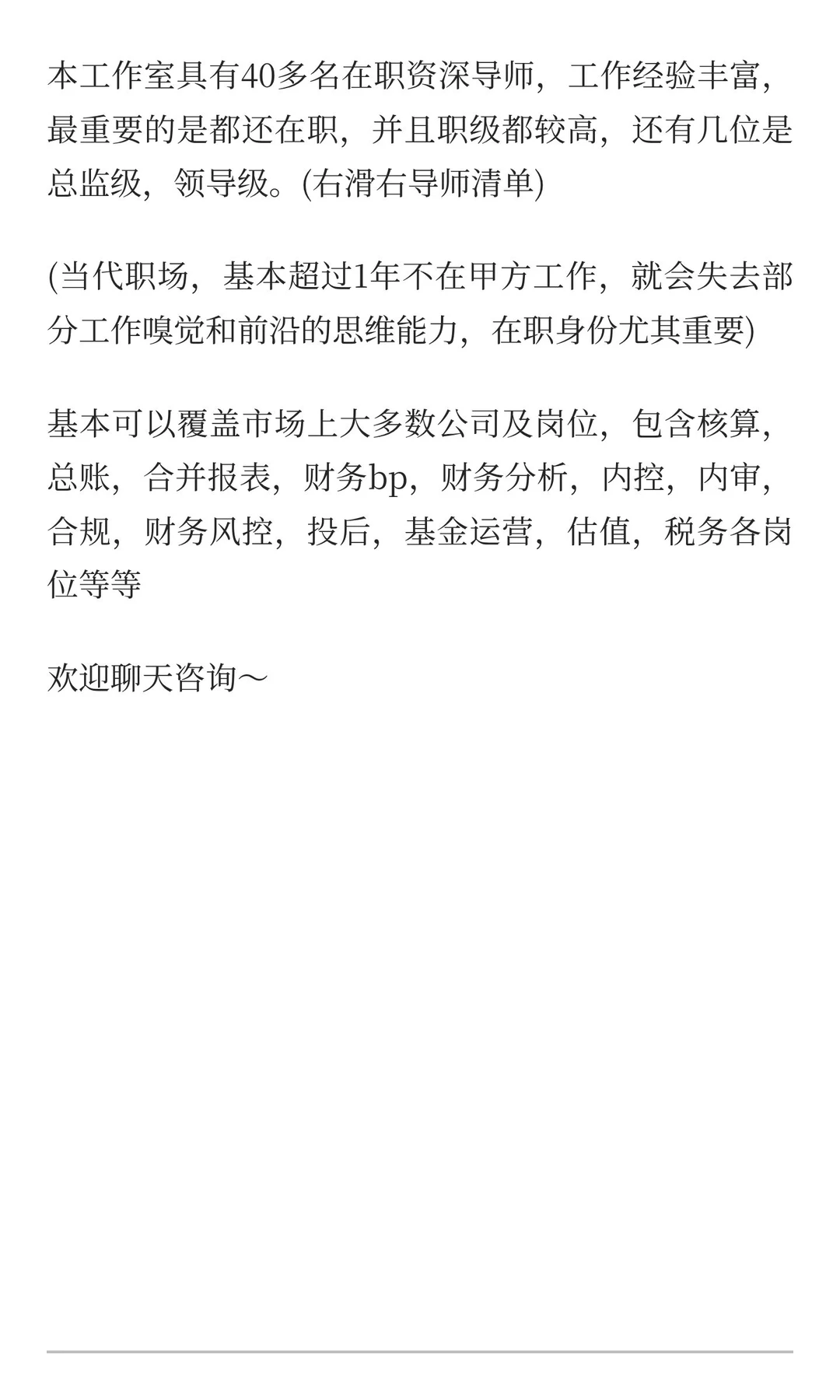 本工作室具有40多名在职资深导师,工作经验丰富,最重要的是都还在职,并且职级都较高,还有几位是总监级,领导级。(右滑右导师清单)