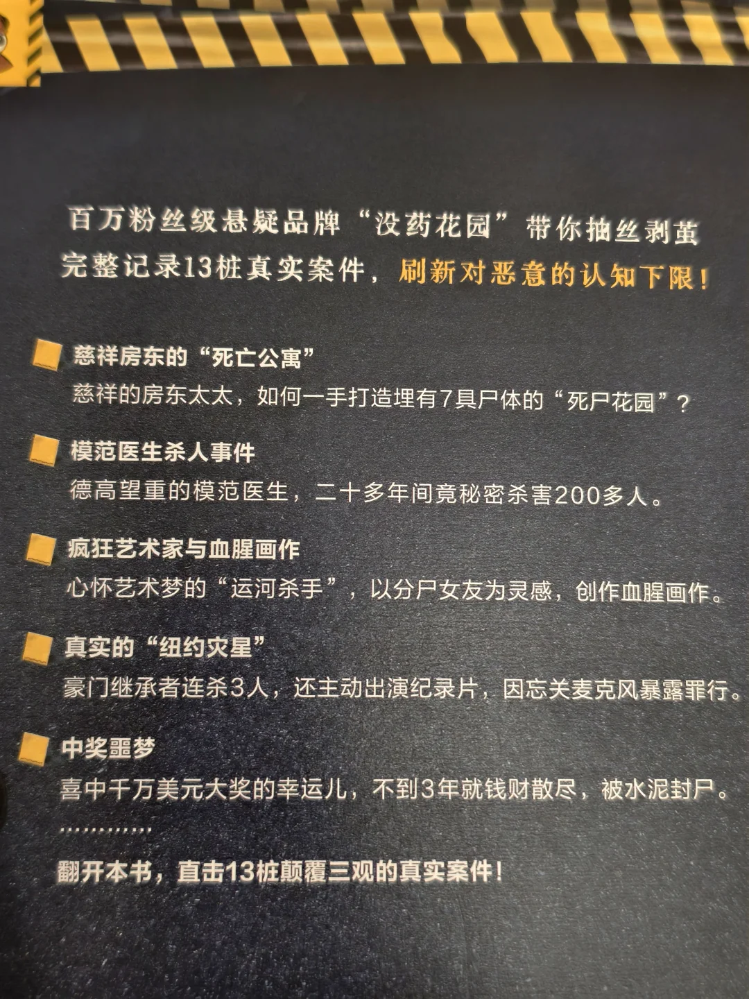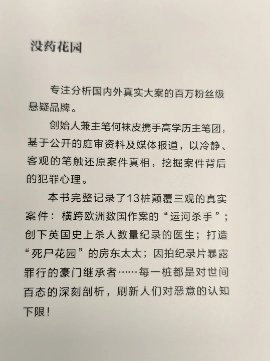 当我看到"慈祥房东的花园埋着7具尸 体"时,第一个反应是:这种连环杀 手肯定是个满脸横肉的变态吧?但作者何袜皮用法庭记录和心理侧写告诉我:这个在社区口碑极佳的房东,作案动机竟是"无法忍受租客搬离的失控感"。她像收藏战利品一样保留租客的私人物品,甚至在尸 体旁摆满他们生前喜欢的鲜花。这种把杀 人包装成"爱的占有"的病态逻辑,比血 腥场面更让人毛骨悚然。