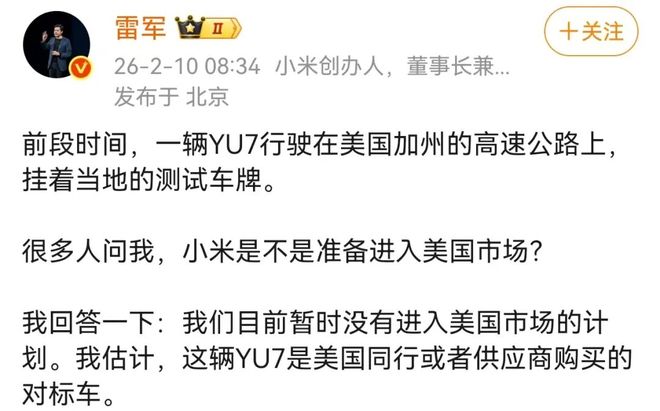 2月10日,雷军在微博发文表示,前段时间,一辆YU7行驶在美国加州的高速公路上,挂着当地的测试车牌。