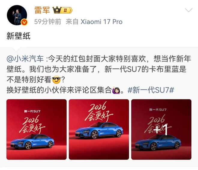 值得一提的是,此前雷军在新年首场直播中透露,小米汽车2026年全年交付目标为55万辆,2025年交付量超41万辆,超过原先计划的30万辆。他希望今年也能超额完成目标。
