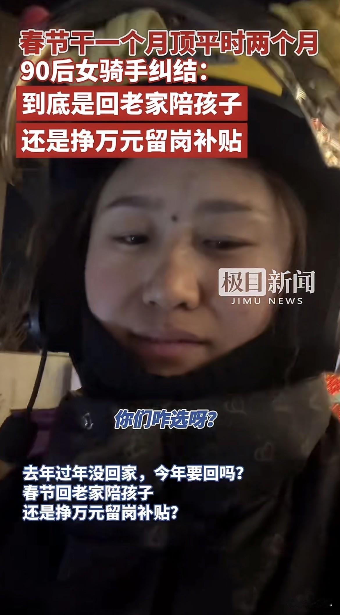 破防了兄弟们,一条自拍视频,1000多万人看完没划走。 2月11号上午,黄亚敏手机震了一下。12306发来订票成功通知,2月12号,北京西到临汾。 她愣了几秒。老公王嘉凯买的。 再一看日期,心里咯噔一下。 2月12号,他生日。 这男的什么也没说。票是悄悄买的,生日也没提。两口子这些年压根不过生日,仪式感早让位给跑单任务了。但他给自己生日那天,买了一张把她送回家的票。 时间倒回2月3号晚上11点22分。 北京大兴,黄亚敏刚送完当天第47单。没着急回租的房子,站在路灯底下,掏手机开了前置摄像头。 黑手套,厚围脖,头盔带子勒出印子。头发被风吹得粘在脸上,她捋了一把,眉头拧着。 过年留岗补贴,7500到10000块。 7500块,大兴800块一个月的一居室,能交9个月房租。 够给孩子买那个念叨了一年的学习机。 她把视频发出去,问了一句:小孩一年只有一次春节,这是不是所有在外打工父母的死结? 4万多条评论。没人能给出标准答案,都说看哭了。 黄亚敏是山西临汾人,今年34。 来北京之前,她在老家县医院当护士。王嘉凯在镇上修电瓶车。 生了两个孩子,奶粉钱尿不湿课外班,工资条越来越不够用。2022年,两口子把护士证锁进抽屉,电瓶车铺子盘出去,一起办了入职,成了北京外卖骑手。 现在俩人每天给自己定死任务:每人至少跑够300块。 300块是什么概念?按一单均价5到6块算,50单往上。从早高峰跑到夜宵档,完不成不回家。 租的房子在大兴,离跑单核心区7公里。每月800,押一付三,这是他们在北京最固定的一笔开销。 去年春节就没回去。两个孩子在老家跟着老人看别家放烟花,视频里问妈妈你什么时候回来。 暑假接来北京住了一个月,送走那天黄亚敏没回头看。她说不敢。 今年平台补贴规则出来了。 淘宝闪购这类平台投入近20个亿,留岗骑手一线城市能多挣上万。补贴截止正月十三,全勤跑满,两口子加起来两万出头。 两万块,能交两年房租,能给俩娃报一整年兴趣班,还能剩点。 她想回,他想留。 王嘉凯跟记者说,我对老婆有愧疚,想多挣点钱,补偿他们母子。 他没跟她吵。意见不同就互相尊重,她回家,他留京。 票是在他手机上买的。2月12号,他生日。 黄亚敏发现的时候已经收到短信了。她没戳穿,也没说谢谢。 在一起十年,有些话不用讲透。 她最后决定放弃自己那一万块补贴,回家陪孩子过完整春节。 不是彻底放弃,算盘打得很精——初四或初五就返京,正月十三截止前还能再跑十天,领一两千块钱。 平台火车票补贴也派上用场了,回乡车票补贴50,返岗补贴100。这点钱跟一万比不算什么,但能省一分是一分。 王嘉凯留在北京。大年三十他跑完单回800块的出租屋,自己煮速冻水饺。 这笔账他是这么算的:妻子在家,孩子在笑,他在北京跑单,电话里听那边春晚的声音。 一万块,买的是这个。 黄亚敏发那条视频的时候问,这是不是死结。 其实她心里早解开了。 她说过一句话,送外卖让她重拾经济自主。这话有点书面,翻译过来就是:自己挣的钱,想给孩子买学习机就买,想给娘家转点就转,不用看任何人脸色。 但她还是选择回去。 两万块和两年没见的除夕夜,她选了后者。 王嘉凯选择留下。生日那天送走老婆,他也没闲着,接着跑单。 他没觉得自己委屈。平台留岗补贴、火车票补贴、天气补贴、单单奖,一单接一单跑下来,是实打实的数字。 他对记者说,这是我对家庭的补偿方式。 有个细节没几个人注意。 黄亚敏那条视频发出来是2月3号23点22分。这个时间她还在路上,骑了十几个小时电动车,头盔摘下来头发压变形。 她没洗把脸再拍,没找角度美颜,就站在路灯底下,裹着棉袄,眉头皱着。 那一瞬间,1000多万人从她脸上看到了自己。 不是送外卖的自己,是那个在年前最后一星期还在算账的自己——这笔钱省下来能干嘛,这趟不回去孩子会不会失望,爸妈身体还好吗,年夜饭缺我一个他们是不是也照样吃。 王嘉凯不擅长表达。他只会买票,跑单,把生日那天空出来送她走。 这男的从头到尾没说自己想她。 明天,2月12号。 黄亚敏检票进站,王嘉凯在站外站了一会儿,转身扫码开了一辆共享单车。 晚上他还得跑够300块。生日不过了,单子不能停。 她到了临汾,推开家门,两个孩子扑上来。 他一个人在北京,手机屏幕亮了,是黄亚敏发的一条微信:到了。 他没回。继续等系统派单。 这张2月12号的车票,没写生日快乐,没写我爱你,没写路上小心。 票面上只有两个字:临汾。 她老家,他生日。 这一万块和这一张票,你觉得谁赚了,谁亏了? 评论区聊聊。
