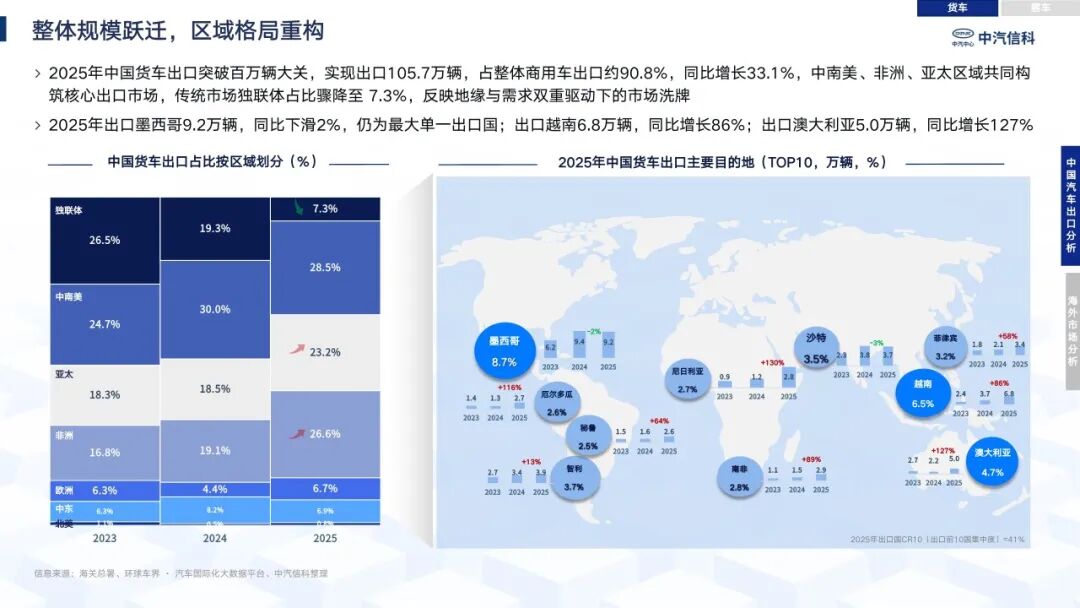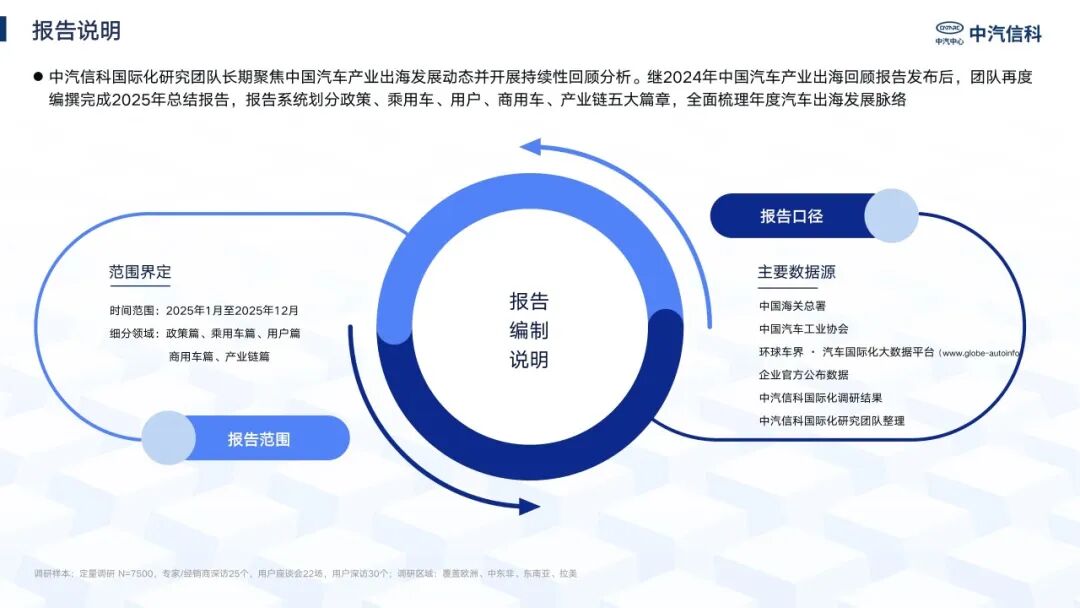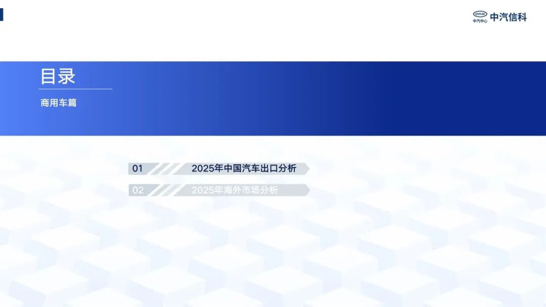 中汽信科国际化研究团队长期聚焦中国汽车产业出海发展动态并开展持续性回顾分析。继2024年中国汽车产业出海回顾报告发布后,团队再度编撰完成2025年总结报告,报告系统划分政策、乘用车、用户篇、商用车、产业链五大篇章,全面梳理年度汽车出海发展脉络。