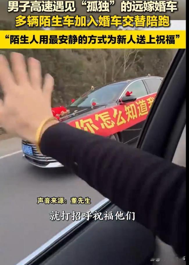 2026年2月11日,江苏无锡高速上演了一幕足以打动无数国人的暖心画面。 (个人观点仅供参考,无任何不良引导) 远嫁他乡的婚车独自奔波在漫长路途,未曾想到会收获一场来自陌生人的盛大护航。这份不期而遇的温暖,恰恰诠释了人间自有真情在。 远嫁本就是一场需要莫大勇气的奔赴,孤身行驶的婚车难免让人心生怜惜。春运与小年交织的高速上车水马龙,这辆没有庞大车队陪同的婚车显得格外单薄。车身简单的装饰藏不住新人奔赴幸福的喜悦,也藏不住独自前行的落寞。谁能忍心看着满怀期待的新人,在奔赴幸福的路上形单影只。 善意的传递从来都不需要刻意安排,一位过路司机的暖心举动,点燃了整条高速的温情。素不相识的车主们不约而同地加入护航队伍,鸣笛送上真挚祝福,双闪点亮前行道路,有序交替陪跑守护新人平安。没有提前筹划,没有利益驱使,大家用最直接的方式,为远嫁的姑娘撑起一片温暖的天地。车内的新人满含热泪挥手致谢,这份来自陌生人的善意,远比盛大的排场更珍贵动人。 人心向善,大爱无言,中国人刻在骨子里的温柔,从来都藏在举手投足的善意里。平凡人给予的温暖,不掺任何杂质,不带半点功利,简简单单的举动,却拥有治愈人心的力量。生活中的美好往往源于这些不经意的瞬间,一个善意的举动,一次暖心的陪伴,便能让冰冷的路途充满温度。 平凡的善意最是动人,陌生的守护最是暖心。愿每一位远嫁的姑娘都能被温柔以待,愿每一份奔赴幸福的勇气都能被温柔守护,愿我们都能心怀善意,在他人需要时伸出援手,让温暖在人间永远传递。