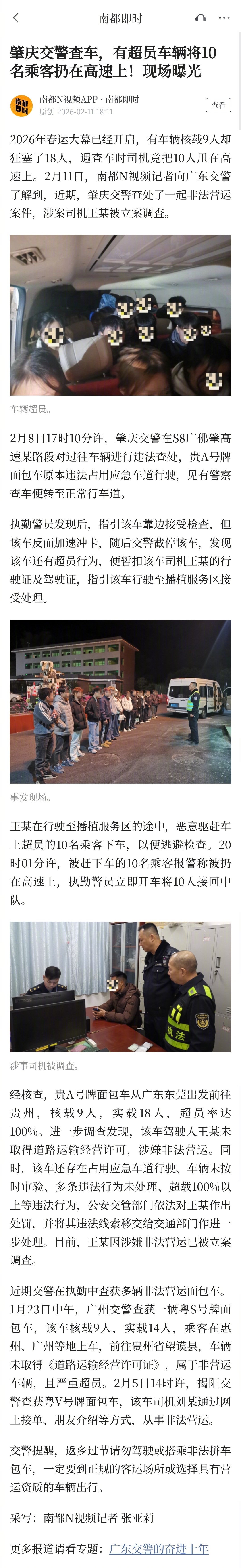 #9座面包车狂塞18人上高速#【肇庆交警查车,有超员车辆将10名乘客扔在高速上!现场曝光】#超载司机遇查车竟把10人扔在高速上#2026年春运大幕已经开启,有车辆核载9人却狂塞了18人,遇查车时司机竟把10人甩在高速上。2月11日,南都N视频记者向广东交警了解到,近期,肇庆交警查处了一起非法营运案件,涉案司机王某被立案调查。