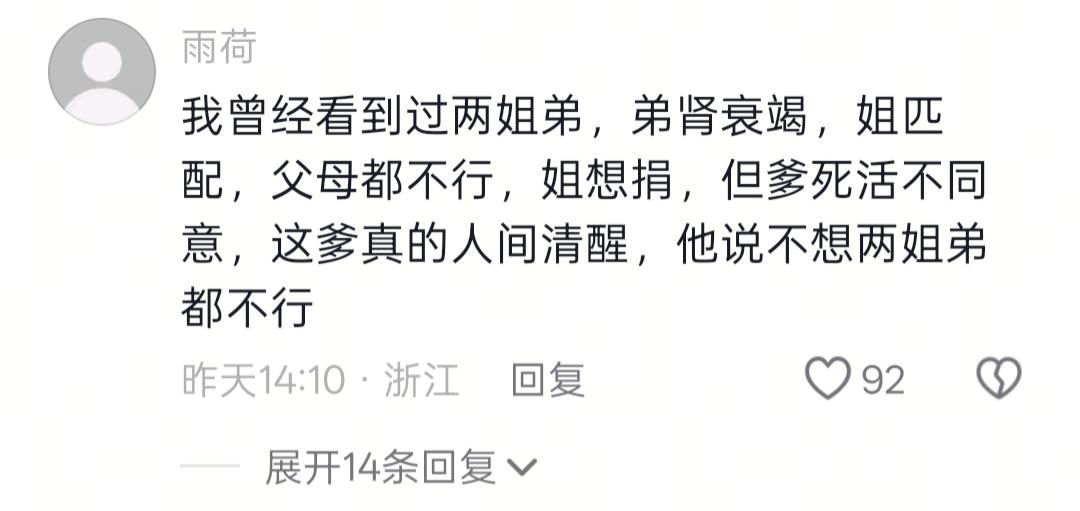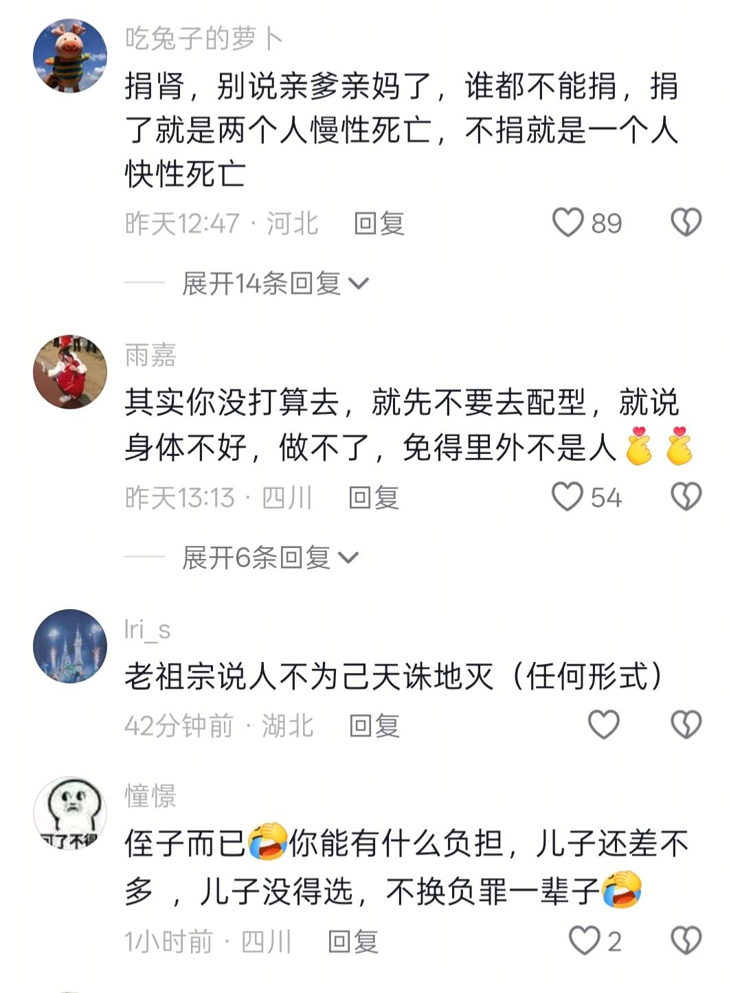 侄子生病需要换肾,全家只有姑姑的肾合适,姑姑26岁,未婚,不同意。但遭到全家的断亲威胁,而姑姑也比较刚,直接断。 现实生活中,有部分姑姑会同意,绝大部分姑姑不会同意吧。26岁多好的年纪,换肾后就成长期病人了吧?她的后半生要如何过了? 不同意,娘家自己哥哥不理解,他们的救子心切确实也能够理解。 这种情况,换肾或者不换,后面确实都会反目的。还不如不换,至少保全了一个!姑姑的选择是对的!