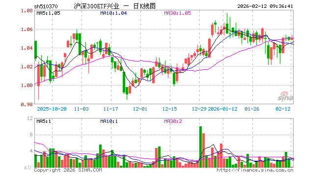 2月12日,沪深300ETF兴业(510370)开盘涨0.00%,报1.048元。沪深300ETF兴业(510370)重仓股方面,宁德时代开盘涨0.54%,贵州茅台跌0.27%,中国平安涨0.15%,中际旭创涨0.58%,紫金矿业涨0.23%,招商银行涨0.00%,新易盛涨0.37%,美的集团跌0.29%,兴业银行涨0.00%,长江电力涨0.00%。