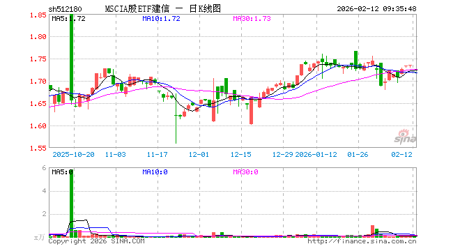 2月12日,MSCIA股ETF建信(512180)开盘跌0.86%,报1.720元。MSCIA股ETF建信(512180)重仓股方面,贵州茅台开盘跌0.27%,宁德时代涨0.54%,招商银行涨0.00%,工业富联涨0.27%,中国平安涨0.15%,紫金矿业涨0.23%,中际旭创涨0.58%,长江电力涨0.00%,农业银行涨0.00%,寒武纪涨0.10%。