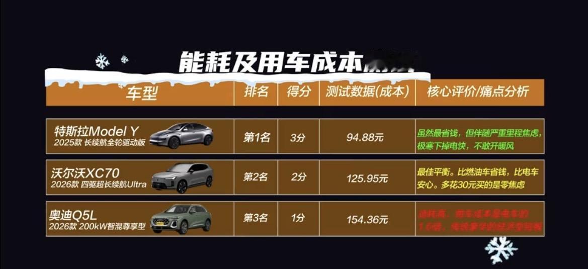 零下20℃极寒大挑战,沃尔沃全新XC70安心又放心? 在零下20℃的极寒环境下,超混,纯电和燃油,谁能做到能耗低,还没有里程焦虑?那我们来看看沃尔沃全新XC70,全新奥迪Q5L和特斯拉Model Y在哈尔滨的能耗及用车成本大挑战吧! 这项测试是在零下20℃的哈尔滨,200多公里的路程包含了小部分城市道路和大部分高速道路,看看谁的的花费最少,最终的挑战结果如何?第一名是特斯拉Model Y,200多公里花费94.88元,不过在测试的过程中不敢开暖风,掉电也快,这对于驾驶者了来说肯定会有里程焦虑。 全新奥迪Q5L为燃油动力,在极寒环境下是不会有续航焦虑,不过油耗也会变高,200多公里花费154.36元,排名第三。而排名第二的沃尔沃全新XC70花费125.95元,不仅比燃油车更省钱,而且相比纯电车没有里程焦虑,这不就是大家需要的安心又放心吗? 那么沃尔沃全新XC70为何能做到低成本和零出行焦虑兼得?自然离不开它的超混技术,可以实现七模全能,再叠加39.6度的电池包,纯电续航超200km,综合续航超1200km,无论城区,高速,还是极寒和极热环境,都能根据路况环境,时刻提供最佳的动力状态,兼具低能耗和长续航。 所以说,想要守住钱包,又要没有里程焦虑,超混技术加持的沃尔沃全新XC70就是首选!【来自懂车帝车友圈】