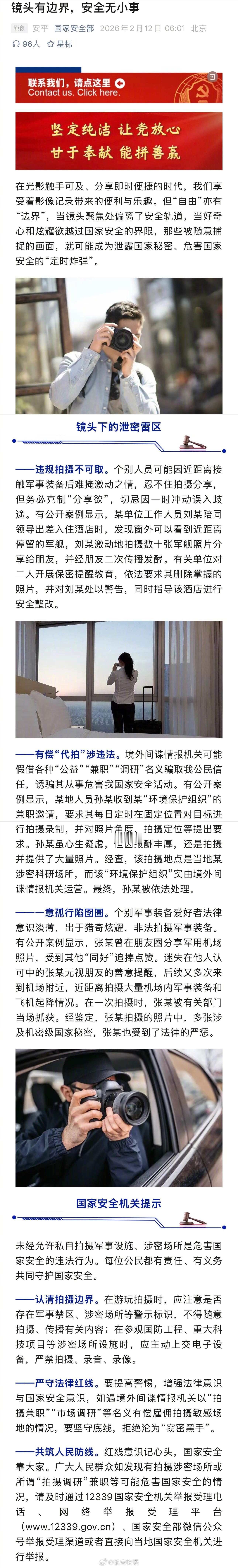 国家安全机关提示:未经允许私自拍摄军事设施、涉密场所是危害国家安全的违法行为。每