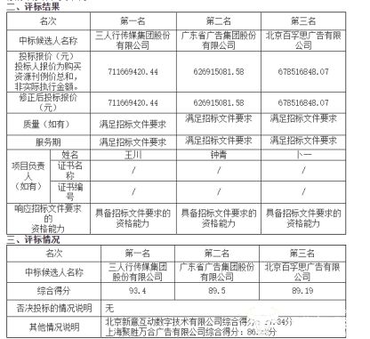 从评标结果来看,共有5家厂商参与投标。其中排在第一的是三人行传媒集团股份有限公司,投标报价约7.12亿元(711669420.44元);