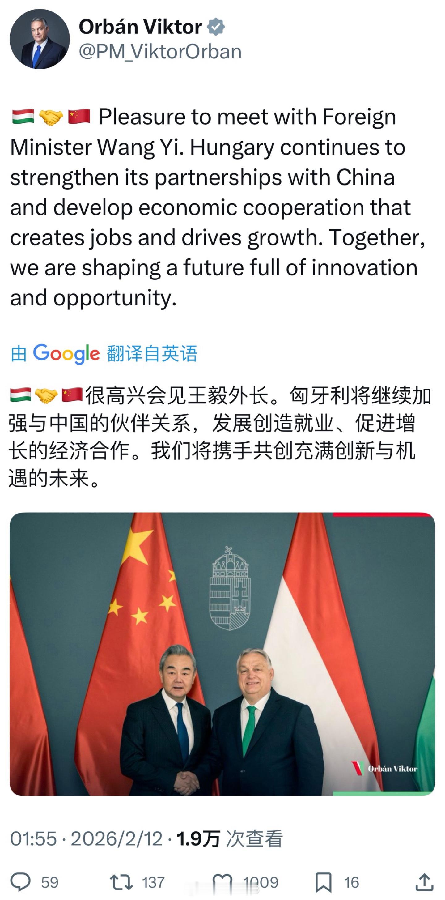 🇨🇳🇭🇺王毅外长访问匈牙利。当地时间2月11日,王毅外长同匈牙利总理欧尔