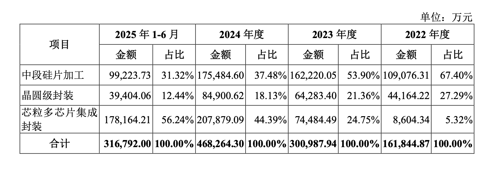 业务转型数据充分展现了这一优势:2022年,公司的收入还主要依赖中段硅片加工(占比67.40%),而到了2025年上半年,以2.5D集成技术为代表的“芯粒多芯片集成封装”业务收入已达到17.82亿元,占比飙升至56.24%。