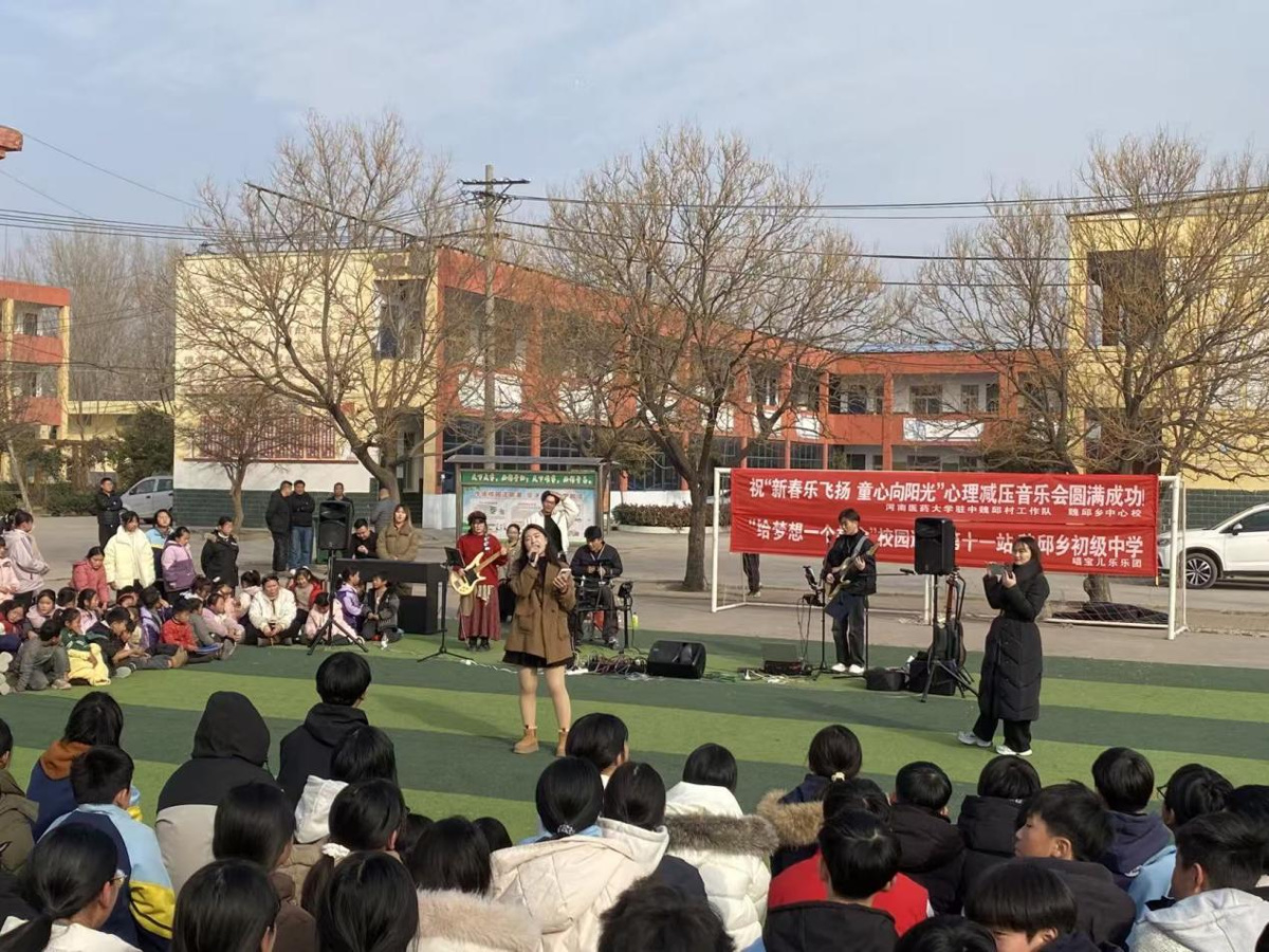 为缓解乡村师生学习工作压力,营造积极健康的校园氛围,近日,河南医药大学驻延津县中魏邱村工作队在魏邱乡初级中学举办“新春乐飞扬童心向阳光”心理减压音乐会。