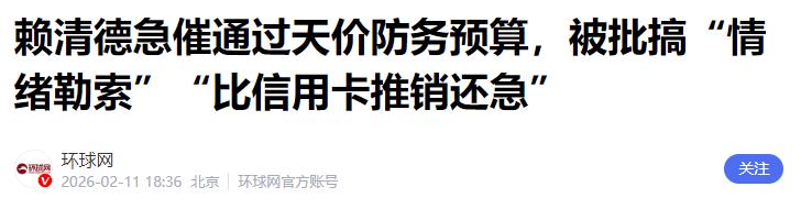 赖清德向在野党“立委”发出最后通牒!2月11日,赖清德率台防务部门高层召开记者会,喊话在野党尽快通过 1.25 万亿新台币特别防务预算,否则三大严重后果由在野党承担。 台海局势又添新波澜,岛内政坛上演一出强硬逼宫戏码,这场公开活动没有半点商量的语气,全程都是强硬要求与警告。 赖清德直接喊话,要求立法机构快速审查、尽快通过,还要确保相关武器能够顺利交付,这种命令式的口吻,让岛内不少人看出来,这不是正常的政策沟通,更像是赤裸裸的政治施压。 他还公开抛出三项所谓的严重后果,用来吓唬反对声音,按照他的说法,预算不通过,台湾可能被移出美国军售优先名单,关键武器装备会被拖延,还会让外部质疑台湾的防卫决心。 这番话明着是讲局势,暗地里就是把责任全部推给在野党,把美国搬出来当挡箭牌。 这笔天价预算从提出到现在,一直卡在立法流程里,国民党始终没有松口,认为如此庞大的开支没有说清明细,也没有充分评估必要性,不该草率放行。 长时间的僵持,让赖清德当局越来越着急,这才选择用公开记者会的方式,发动舆论攻势。 现场阵容足以说明当局有多焦虑,台防务部门负责人悉数到场,用军方高层集体站台的方式,营造出“军情紧急、刻不容缓”的氛围,试图用这种阵仗压服在野阵营接受方案。 赖清德在现场还不断强调所谓的防卫理念,声称和平不能靠幻想,不能靠协议,只能靠实力,备战才能避战,能战才能止战。 这些说法看似有理,实则是在为对抗路线找借口,本质上是拒绝两岸和平可能,坚持把台湾往备战对抗的方向推。 明眼人都能看清,这套说辞背后藏着小心思,不断渲染威胁、抬高军费、抱紧外部势力,目的就是推进分裂企图,用台湾民众的血汗钱去买武器,把宝岛变成危险的“火药桶”,完全不顾普通百姓的生活与安全。 这笔巨额预算一旦通过,最终买单的还是台湾普通民众,民生建设、社会福利、医疗教育都会被挤占资源,而买来的装备能不能真正保护民众,答案早已很清楚。 更多人看得明白,这更像是交一笔高额“保护费”,满足的是外部军火商与少数人的政治利益。 台湾作为中国不可分割的一部分,两岸走向和平融合才是民心所向,也是大势所趋,靠花钱买武器、靠抱外部大腿搞对抗,根本换不来安全,只会把台湾推向风险边缘,损害的是全体台湾同胞的切身利益。 任何企图分裂国家、制造冲突的行为,都违背历史潮流与民族大义,只有回到坚持一个中国原则的正确轨道,推动两岸关系和平发展,扩大交流合作,才能真正守护台海稳定,给台湾民众带来踏实的安全感与长远福祉。 大家对此有什么看法呢?欢迎各位在评论区留言!