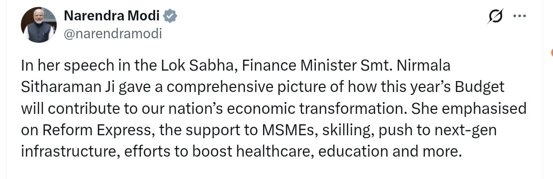 莫迪:财政部长尼尔马拉·西塔拉曼女士在人民院发表讲话,全面阐述了今年的预算将如何助力国家经济转型。她重点强调了改革快车、对中小微企业的支持、技能培训、推进下一代基础设施建设、以及在医疗保健、教育等领域的投入。