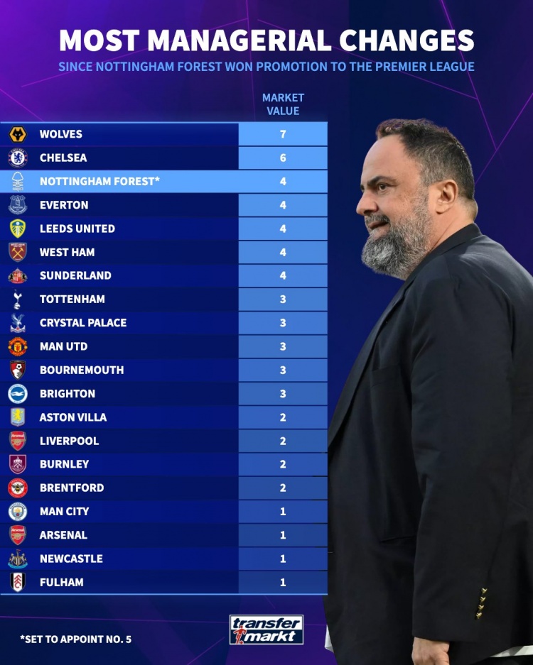 直播吧2月12日讯诺丁汉森林官方宣布,主帅戴奇下课。德国转会市场统计了诺丁汉森林2022-2023赛季开始征战英超以来,英超各队的换帅人数,狼队7人最多,切尔西6人第二,诺丁汉森林4人并列第三,即将任命第5位主帅。