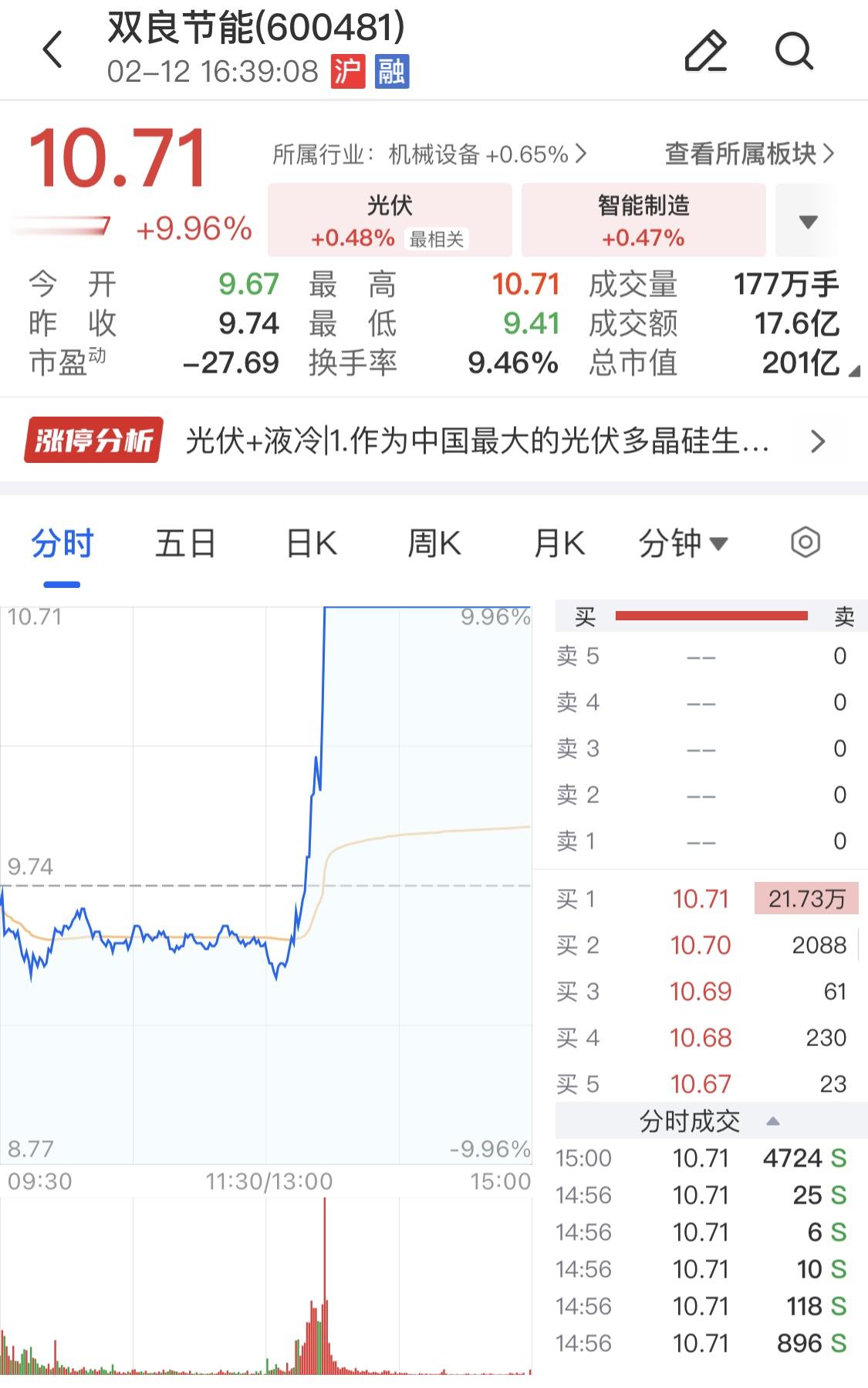 财联社2月12日讯,今日午后开盘10分钟左右,双良节能股价异动,并快速拉向涨停。截至收盘,其股价报10.71元/股,市值为201亿元。消息面上,今日13:02,双良节能在微信公众号上发布“近日再获3个海外订单”消息,而交易关联方正是马斯克旗下太空探索技术公司SpaceX。