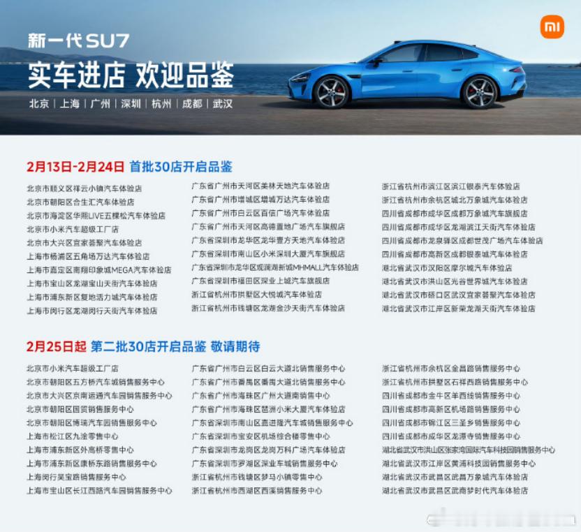 日前,小米汽车官宣,新一代SU7卡布里蓝将在13日起开始到店,首批将覆盖北京、上海、深圳、广州、成都、杭州、武汉在内的7座城市30家门店。而2月25日起第二批将进店,同样覆盖30家门店。