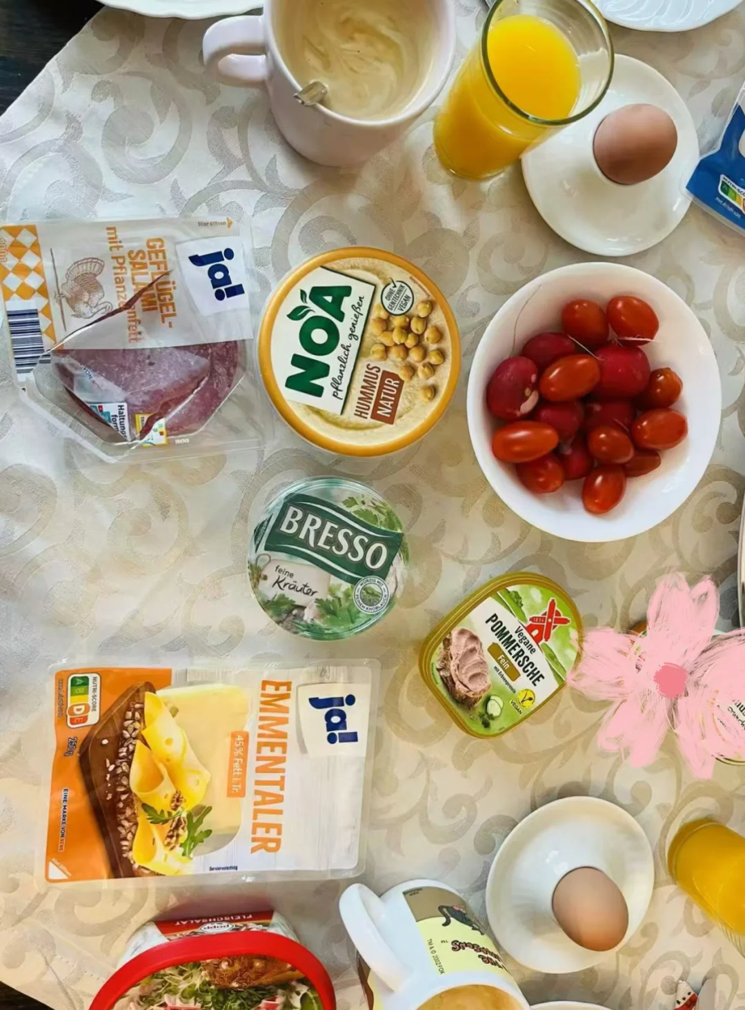 来德国的第10年 终于适应了德式的早餐 新鲜出炉的面包,鸡蛋,各种切成片的火腿 奶酪🧀 一杯来咖啡,一杯橙汁 各种蔬菜 这应该是德式早饭的高规格了吧 最近新爱上了一个吃法: KoRo花生酱+奶酪 这个花生酱是我在korodrogerie de网站买的,一个出售有机商品的网店。 你适应德式早餐用了多少年?