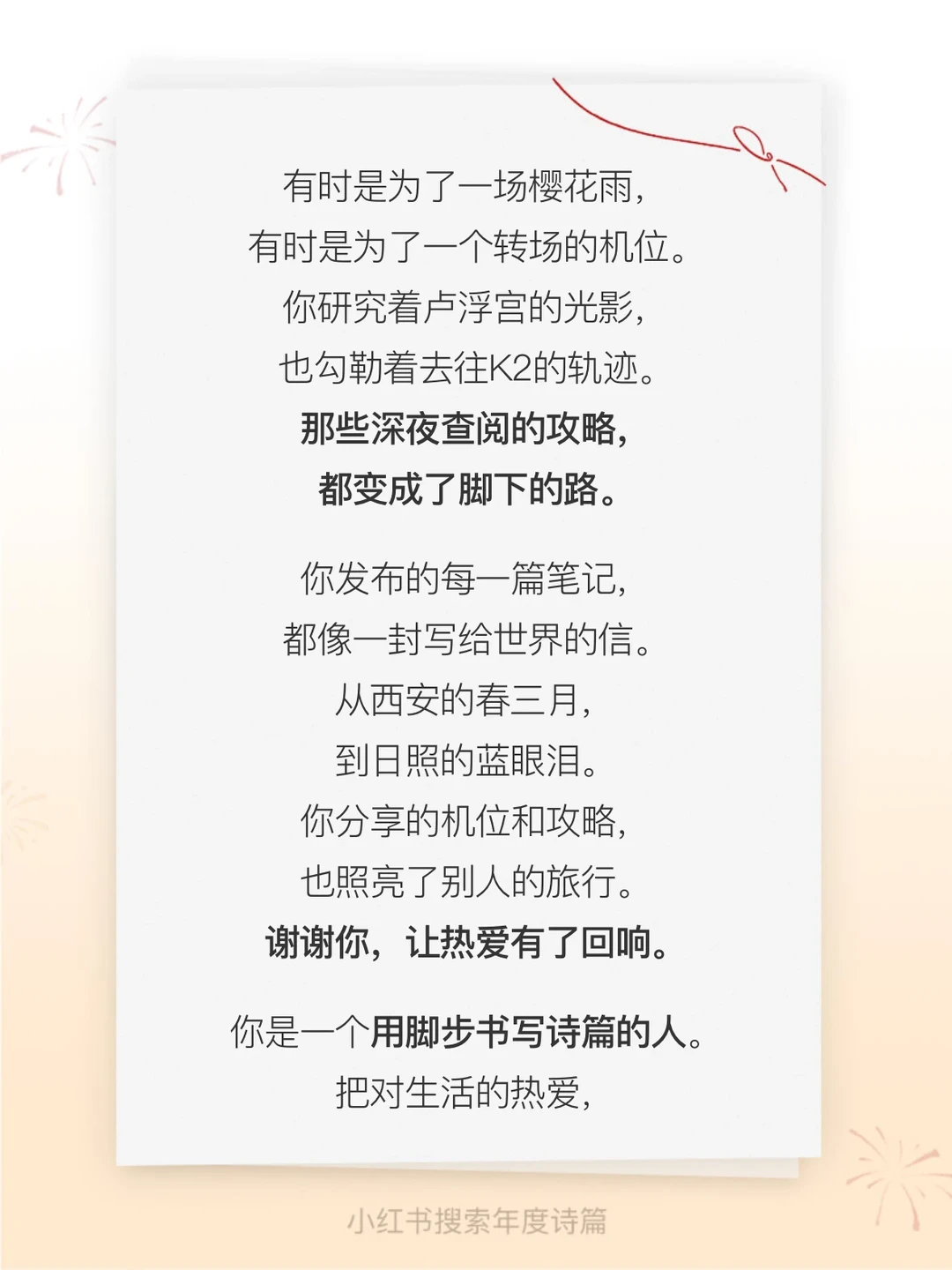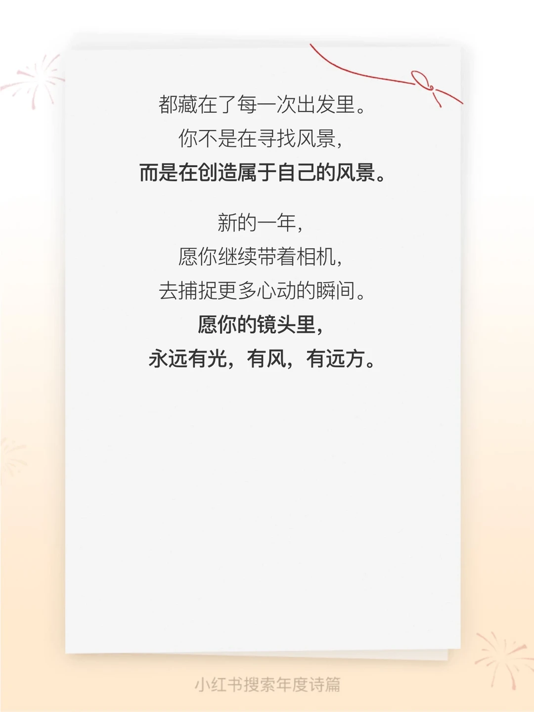 “把对生活得热爱,都藏在了每一次出发里” “愿你的镜头里,永远有光,有风,有远方” 真的有被这些句子狠狠戳到心灵…… 只能说太懂我了 2.10起,在搜索🔍“年度诗篇” 获取你的专属年度诗句。