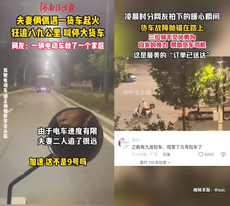 这位宁波小哥的勇气并非孤例。似乎在九号车友中,这份热心已悄然成风。就在前不久,也有九号车主在公路上敏锐察觉前方货车轮胎异常起火。他加速追上,持续鸣笛并用呼喊提醒司机,最终成功避免了一场可能发生的严重事故。还有一位小哥,默默用九号电动车帮助拖移故障车辆,即使是电动车也爆发了巨大的力量……这些故事没有惊天动地的场面,却充满了街头巷尾的真实温度。