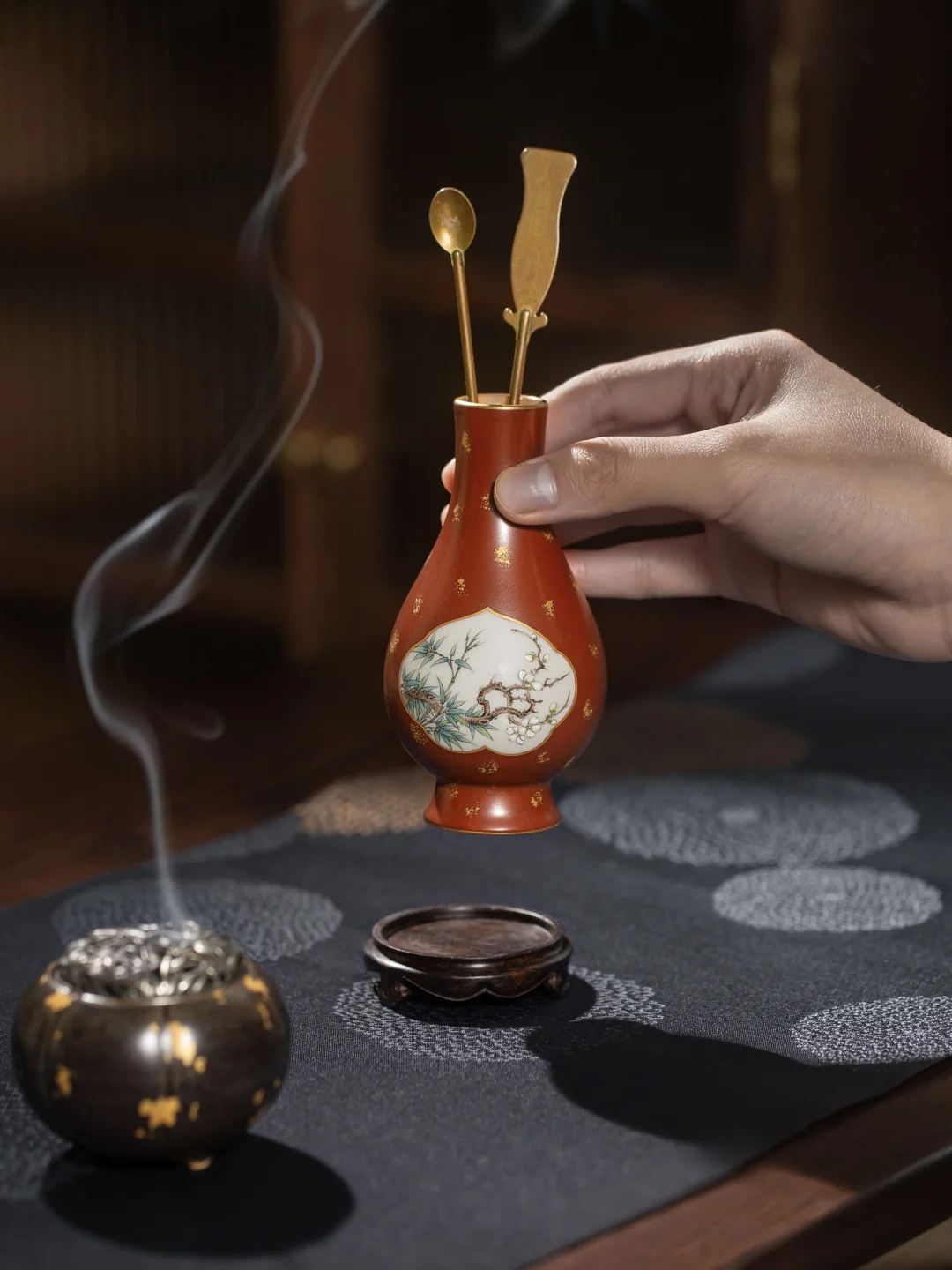 瓶身开窗,手绘梅竹相映,洒金点点温雅。它既可收纳香具,亦可独作笔筒,让梅竹的清气与坚韧,日日陪伴案头的思绪与书写。