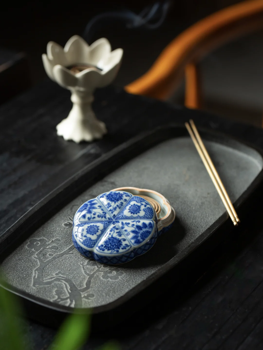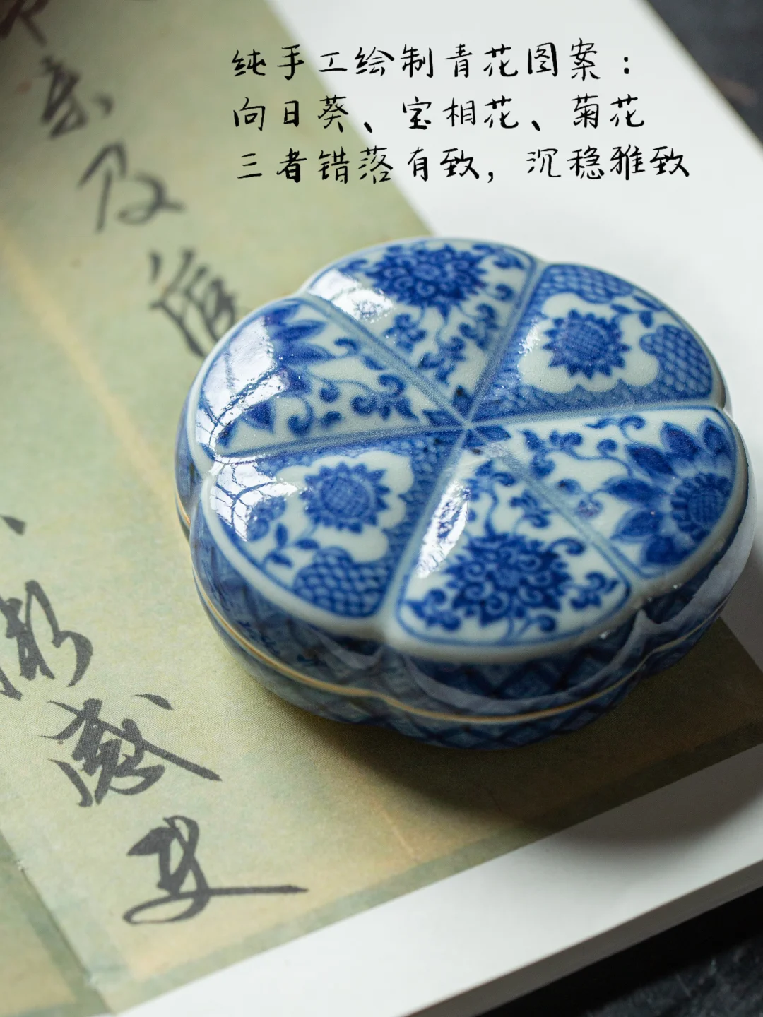 葵瓣盈盈,青花绘就吉祥花卉。它妥帖收纳印泥或香品,盖合之间,仿佛将“心思如花绽放”的愿景也轻轻合拢,是案头一隅生动的期盼。