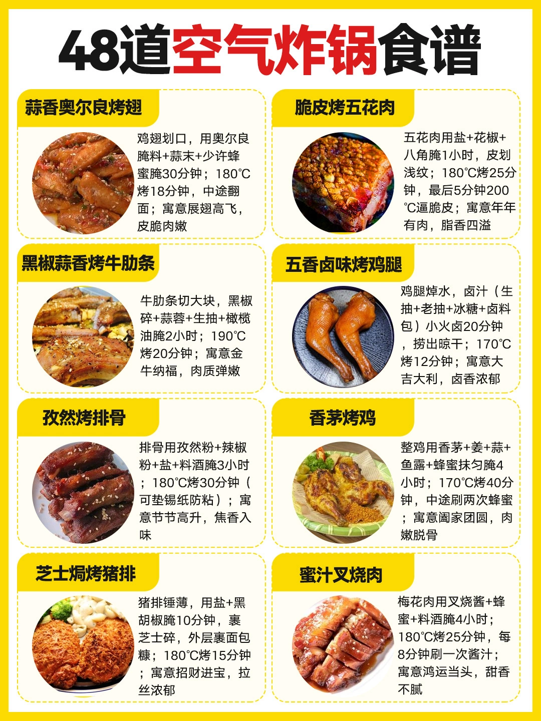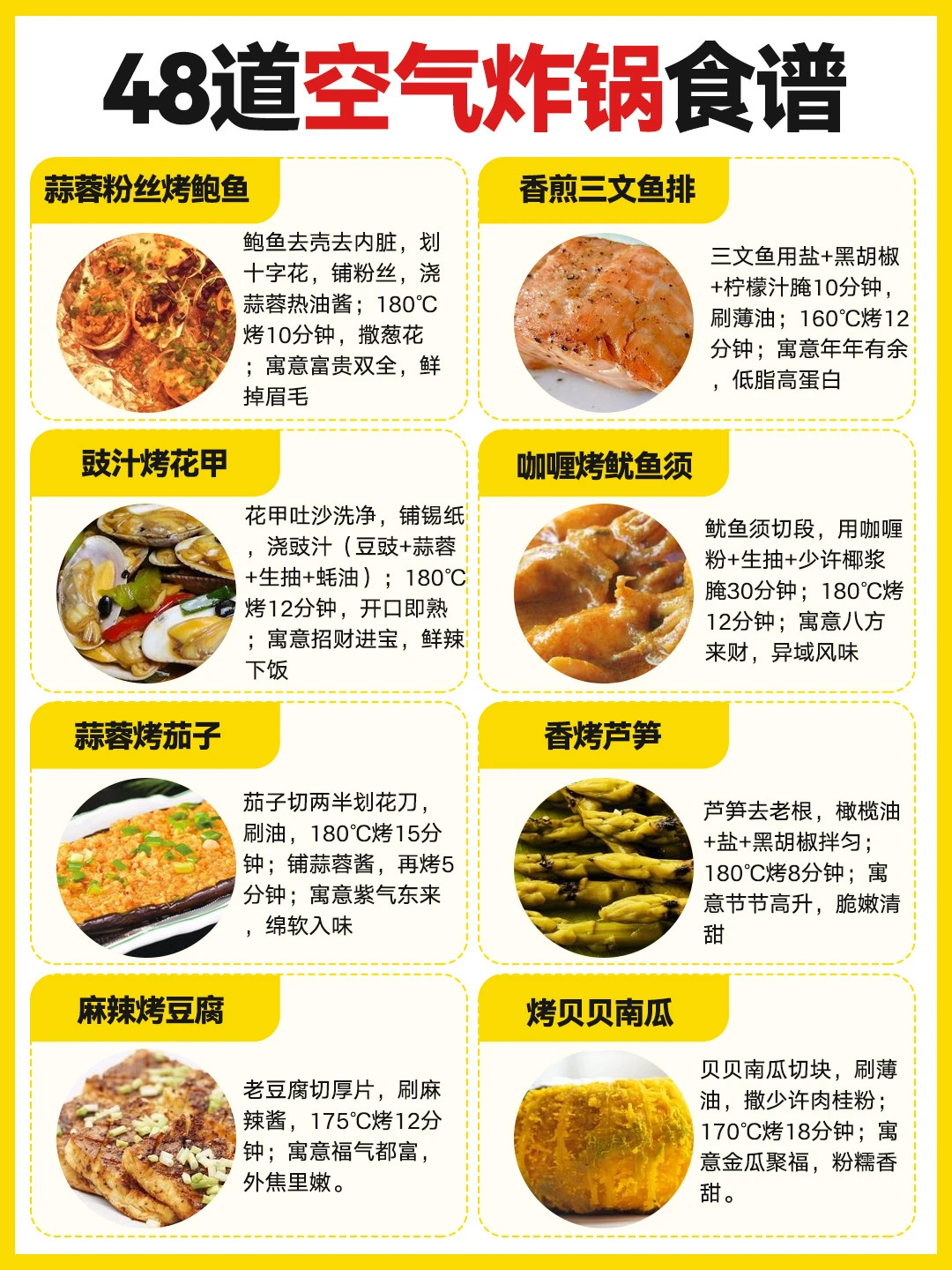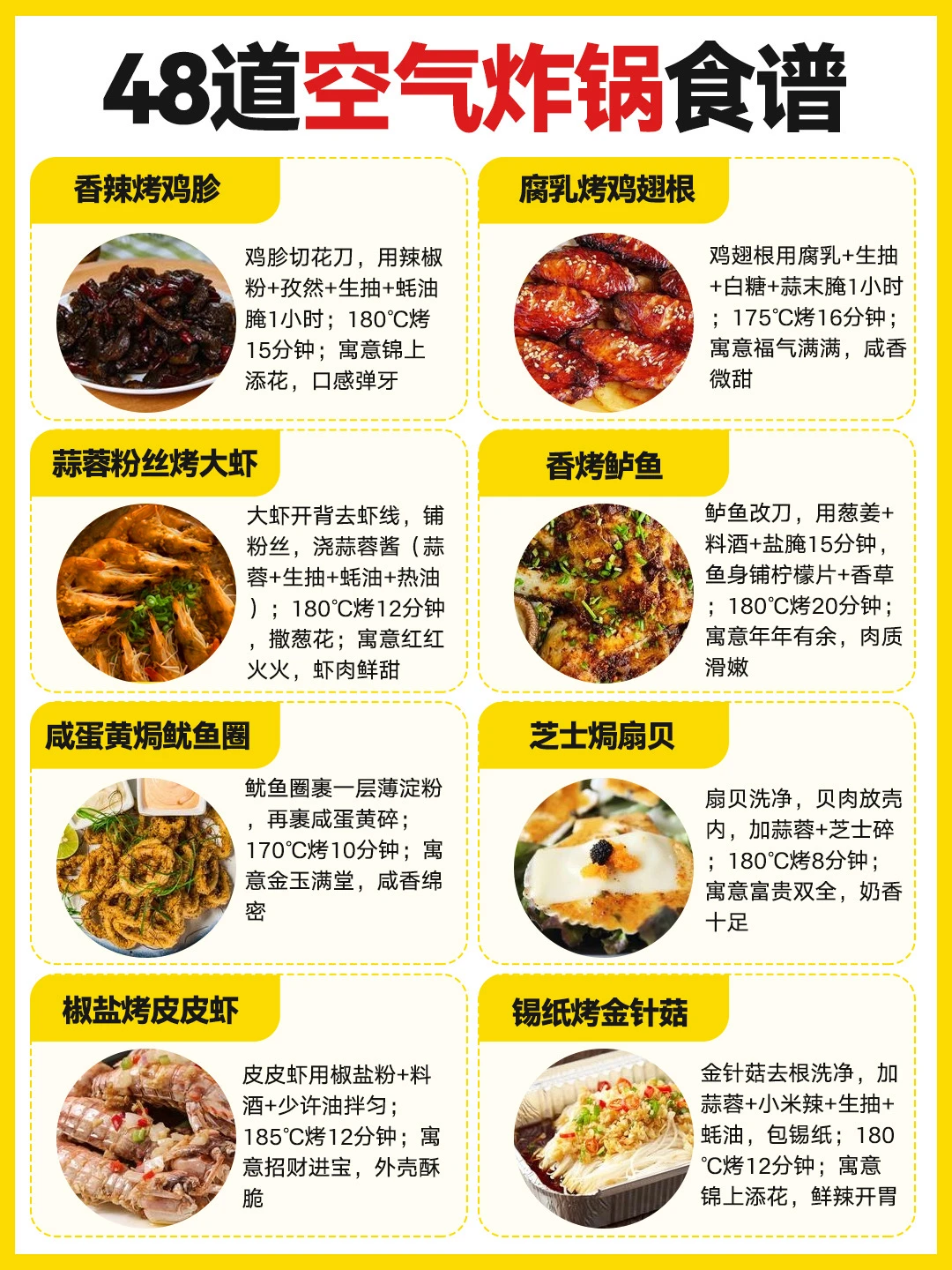 年夜饭又有新菜了!万物皆可空气炸😄这48道菜全是专为空气炸锅量身搭的懒人菜谱,做法简单、出锅喷香,零厨艺也能轻松拿捏!建议打印出来,贴厨房年夜饭照着做