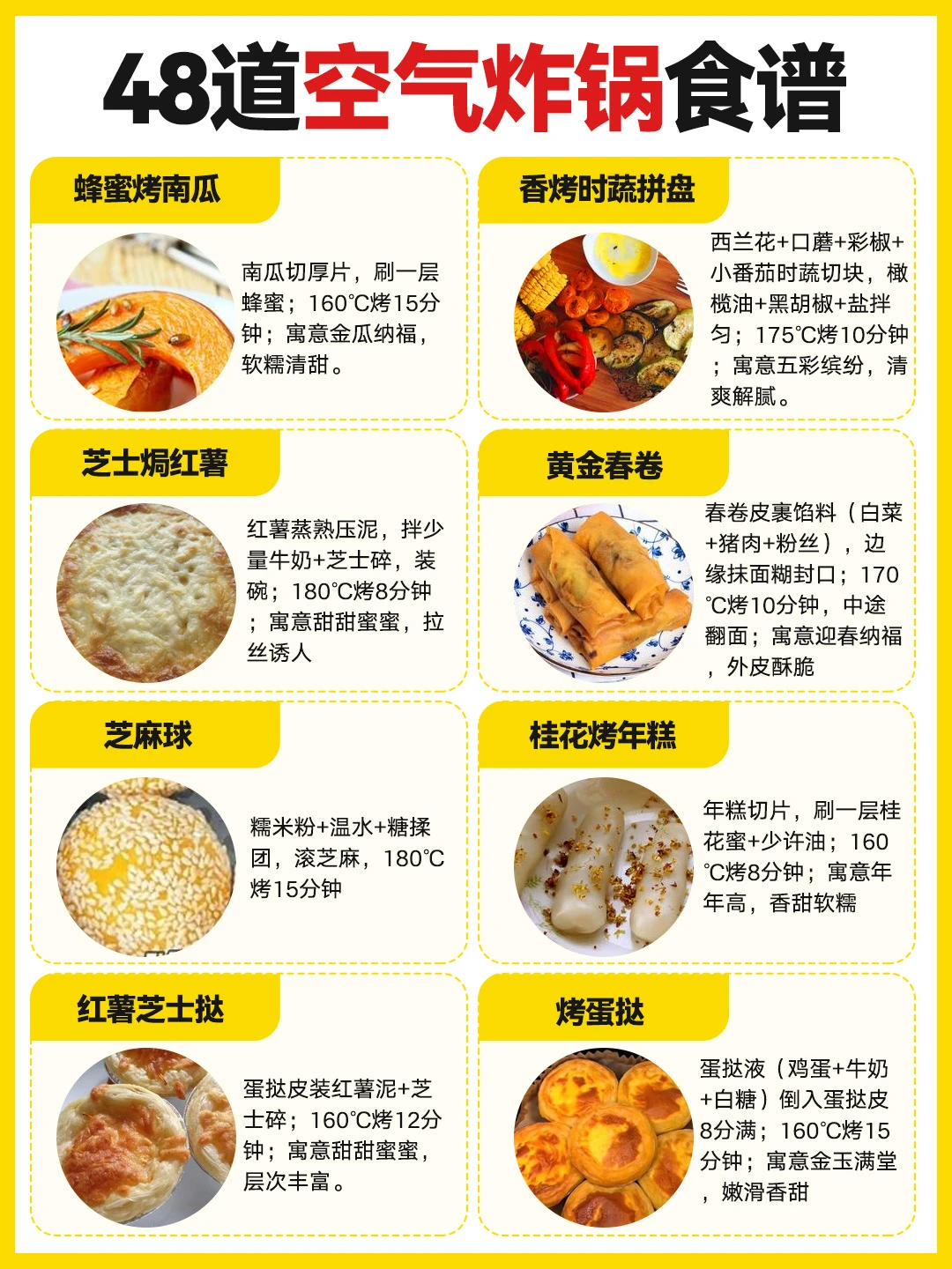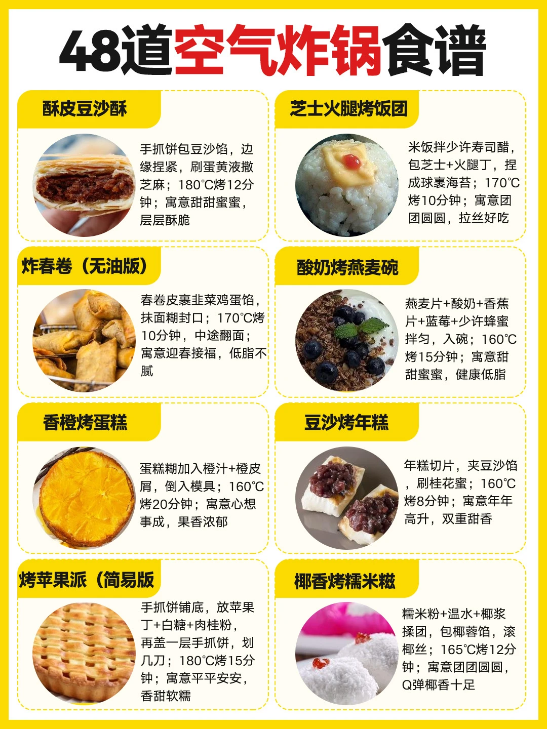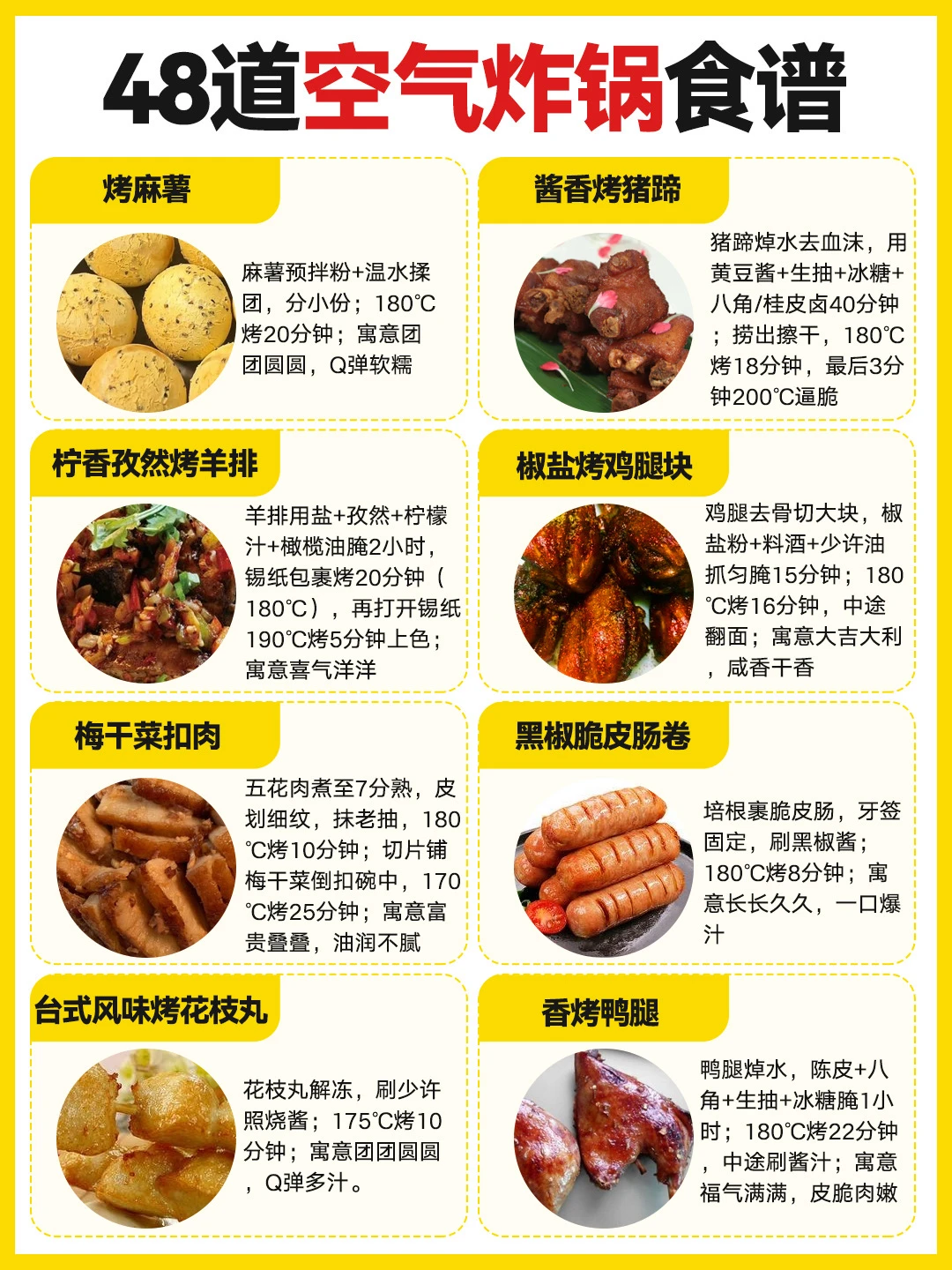 年夜饭又有新菜了!万物皆可空气炸😄这48道菜全是专为空气炸锅量身搭的懒人菜谱,做法简单、出锅喷香,零厨艺也能轻松拿捏!建议打印出来,贴厨房年夜饭照着做
