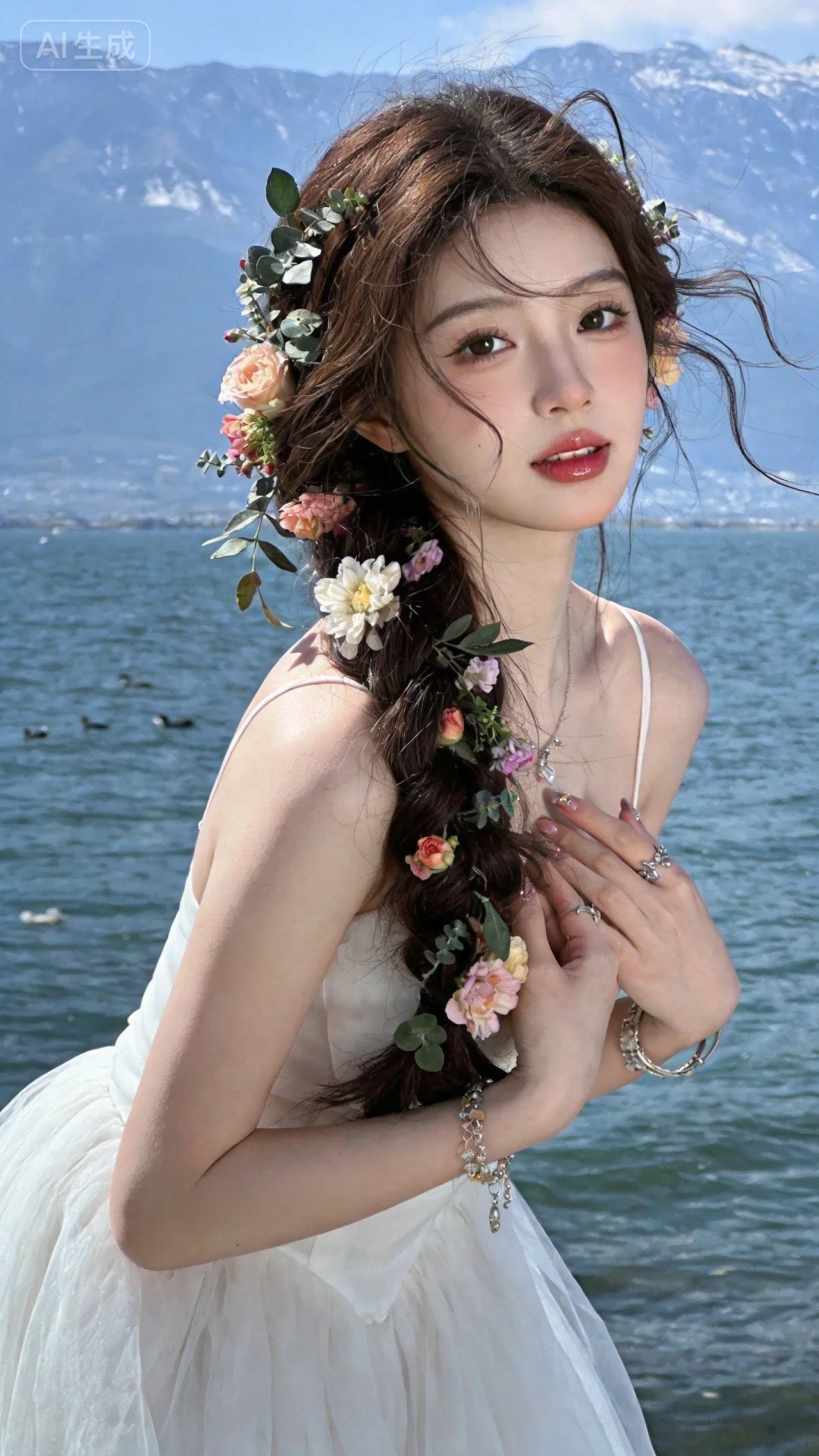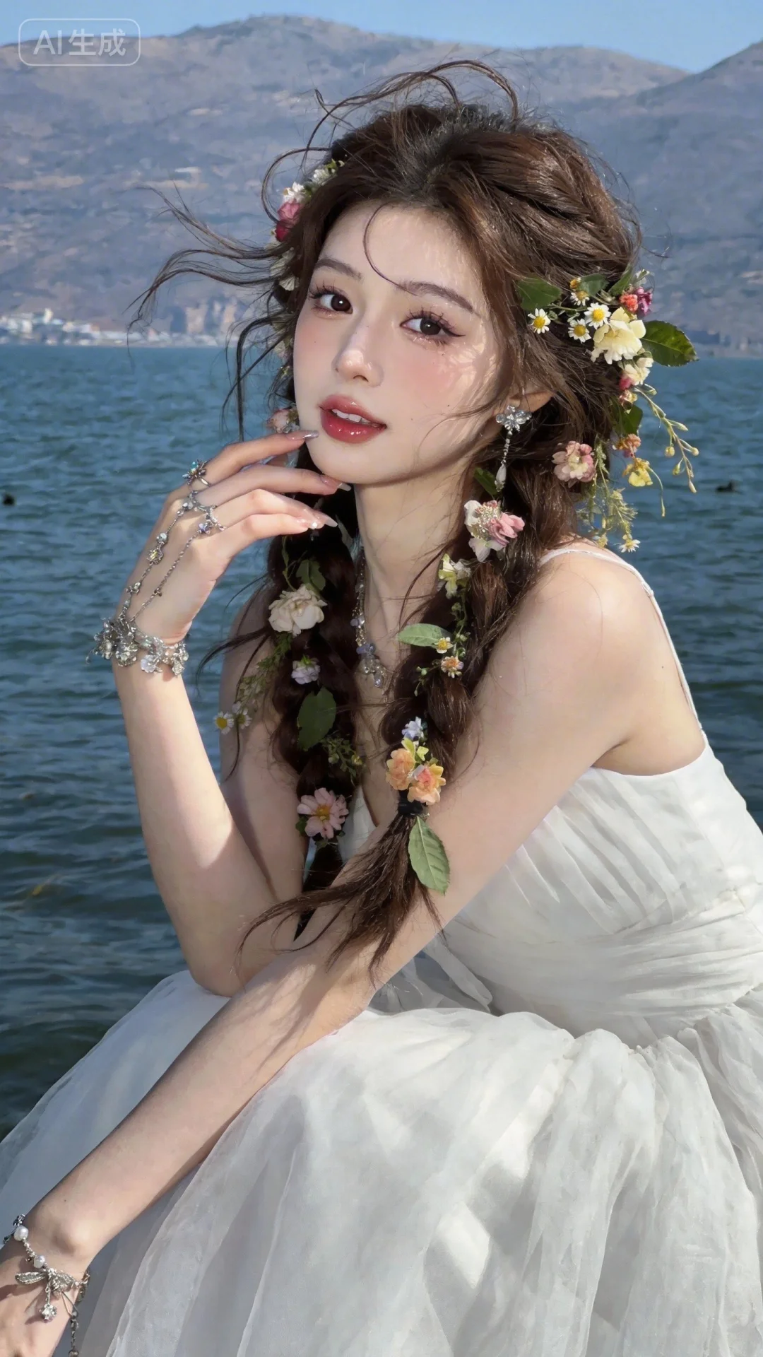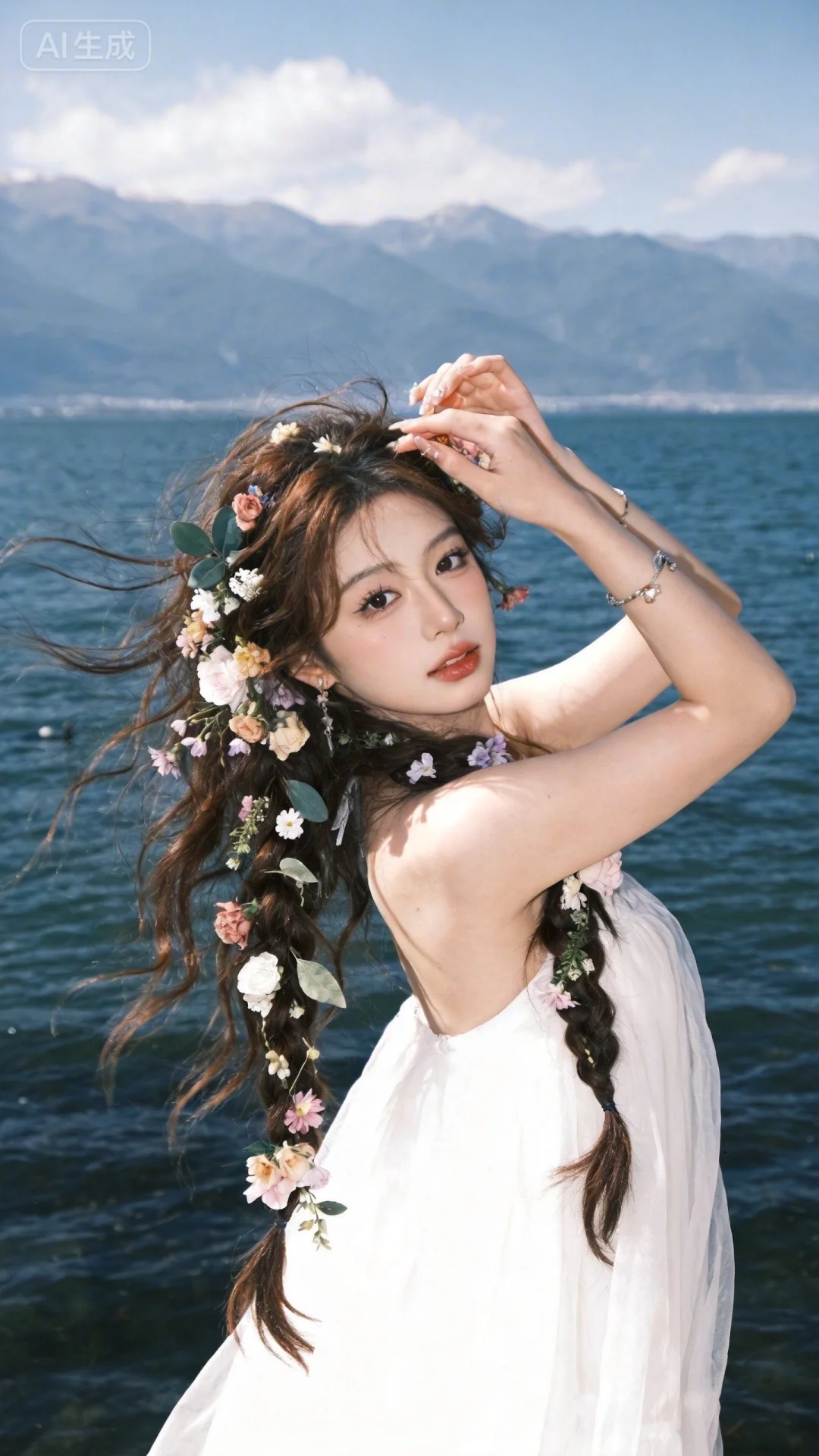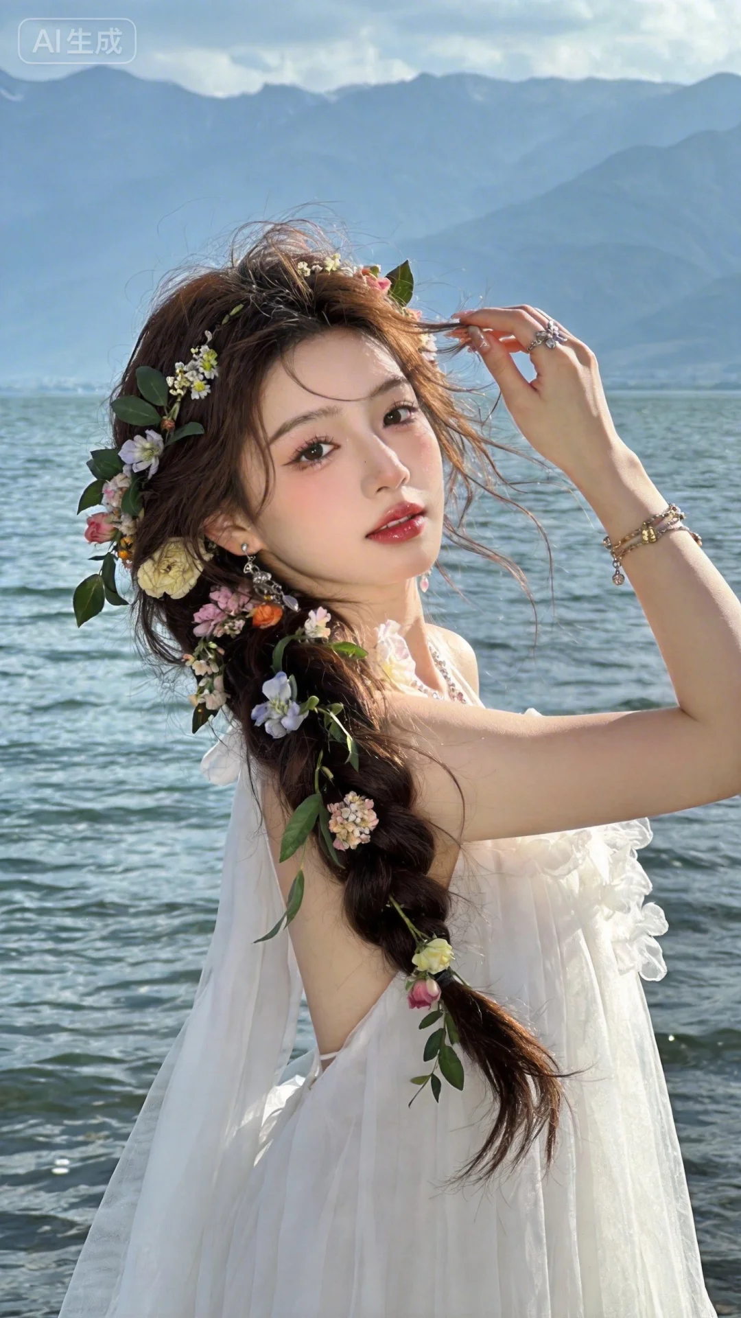 在洱海海边,背景是苍山,超清晰画质,妆造精致,饰品精巧,棕色长发上编织许多鲜花和叶子搭配,头发和鲜花花巧妙结合,身着白色飘逸长裙蓬松极简风格,细节完美,五官精致,突出头发凌乱美,面部清晰,清冷调。日常快照风格,非精心构图,非专业打光。(电影级面光:1.6),(光线追踪:1.5),(冷白皮漫感质感的光滑皮肤:1.7),(人物有最好的骨相:1.2),(网感脸:1.6),(网感妆:1.6)身材完美,莫兰迪配色,高颜值网红,INS风,幼态脸,19岁女生尖下巴,三庭五眼比例均衡,细腻陶瓷水嫩肌肤,偏冷白皮,随机的妆容,随机的饰品,随机的动作,侧光,发丝轻飘,凌乱,随机角度拍摄,总体有很多的不确定性,但又好看,
