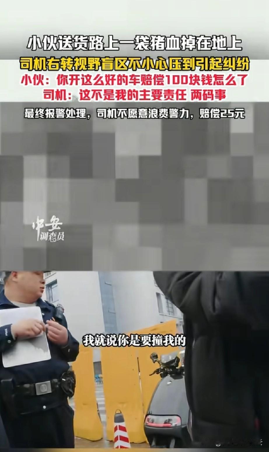 湖北武汉,小伙骑电动车掉到路上一袋猪血,还没来得及捡起来,被一 男子开车右转时给压碎了。 因为猪血本来就在地上,男子又是视野盲区,所以男子觉得他的责任不大,可让他没想到的是,小伙一张口就要他赔100块。 车主不同意,本来就是你责任更大,再说一袋猪血也没有100块。小伙却说你开这么好的车,还差这100块钱吗?如果你不赔,我就报警,告诉帽子叔叔是你撞的我。 男子本来还想协商的,一听小伙这么说,就很反感,他说你可以报警,我不跑全程配合。不是你说什么就是什么,我有行车记录仪。 帽子叔叔来了后,小伙又换了一套说辞,他说男子转弯时,他明明招手了,但是男子还是没停车,压碎了地上的猪血。他让男子赔50块钱走人的,但男子不赔。他打电话给他妈,他妈妈说这袋猪血值100块。 车主辩解,他根本没看到小伙招手。压到猪血后下车查看时,猪血本来没全压碎,结果小伙不管拿起来,后来又让别的车给全压碎了。 帽子叔叔可能觉得猪血不值钱,也不是大事。就让他们各退一步,协商解决。小伙说他要50块钱就行,车主不同意,帽子叔叔让他们去派出所协商。 后来车主还是发视频说,他最后还是怕麻烦,赔了25块钱了事。 虽然事情解决了,但是网友们却不满意,有人虽然事不大,但是小伙看着豪车就讹人让人反感。不能就这样算了,这次让他赚便宜了,他以后碰到这种事还会讹人。 有网友扒出小伙供货饭店的名称,去饭店留言,饭店吓得关了评论区。 还有网友指出,猪血属于易腐生鲜动物食品,必须用专用的冷藏车或是专业设备在0–4℃下冷藏运输,这个小伙用电动车驮着根本就不符合标准,可是去质检部门举报。 小伙估计没想到吧,一袋猪血虽然不值钱,但是信誉很值钱。为了多要100块钱,撒谎、威胁都用上了, 以后饭店估计不会再要他家的货了,这也算咎由自取吧! 对于这件事,你怎么看呢?