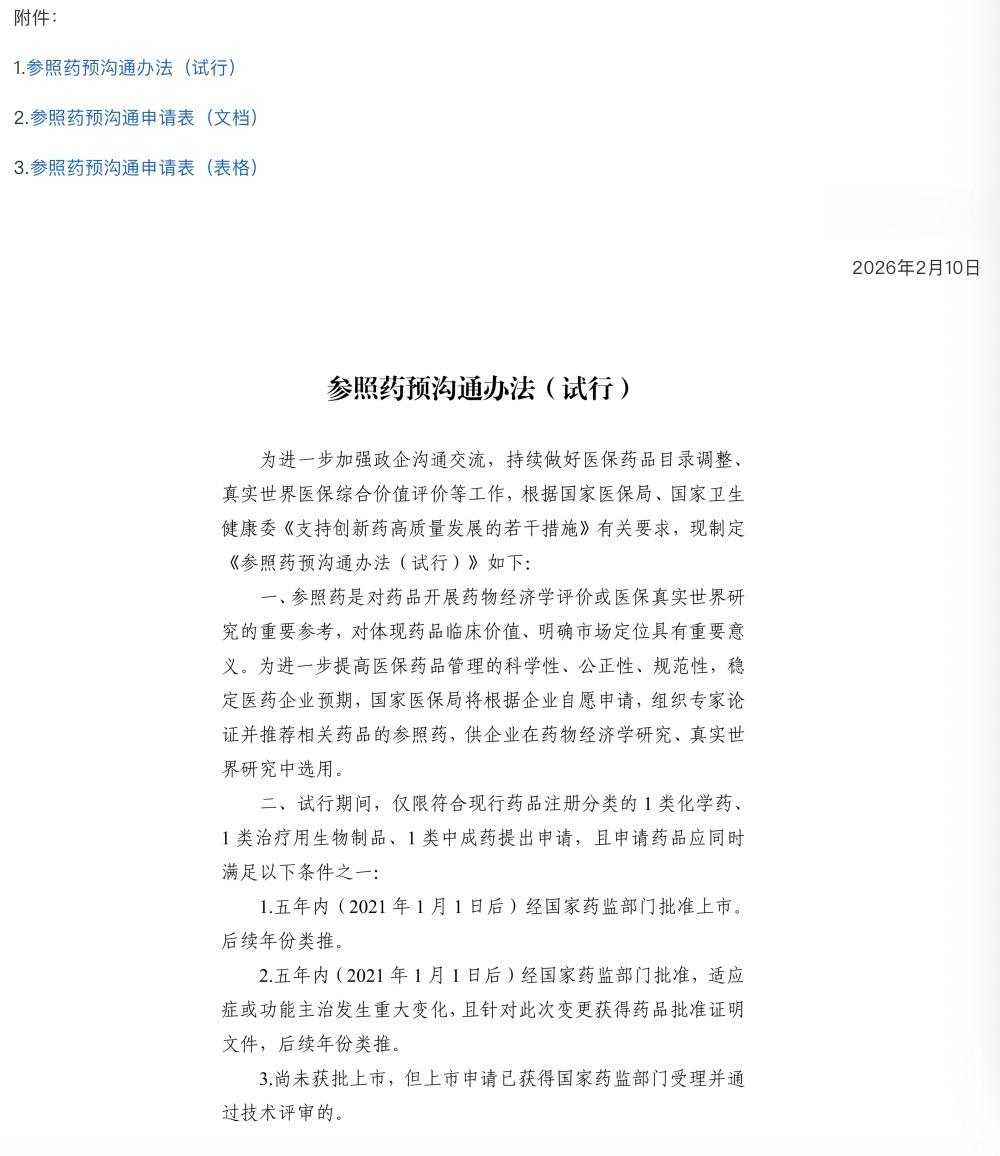 国家医保局2月10日发布《参照药预沟通办法(试行)》,优化评审规则。参照药是指在医保目录谈判中,作为评估新申报药品价值的“参照对象”,通常是与新药治疗领域、作用机制相近的医保目录内药品。