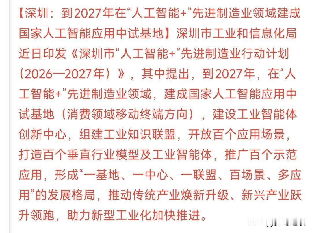科技股大利好消息来了,明天科技股板块基本稳了 深圳连发两条利好,涉及人工智能和半导体产业,就是给2026年定下了目标。 人工智能:到2027年,建成人工智能中试基地。 半导体:推动人工智能应用于半导体产业链的关键环节。 这是整个2026年的目标,是必须要完成的,其中很多公司都会受益,这种建设需要很多人工智能的基建配套,譬如服务器,算力等等。 科技股板块今年以来已经涨了13.11%,如果没有意外今年科技股的牛市将会继续,只不过会分化很严重,市场紧缺的继续往上走,市场饱和的就要调整了。