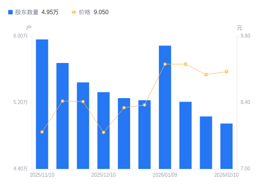 日期A股户数(户)流通A股户均持股数(股)户均持股市值(万元)2026-02-104947110811.809.782026-01-305032010629.399.562026-01-205208810268.609.462026-01-09588569087.798.372025-12-315228210230.498.542025-12-195252410183.368.442025-12-105325610043.397.802025-11-28544279827.308.272025-11-20567599423.547.942025-11-10596068973.446.98