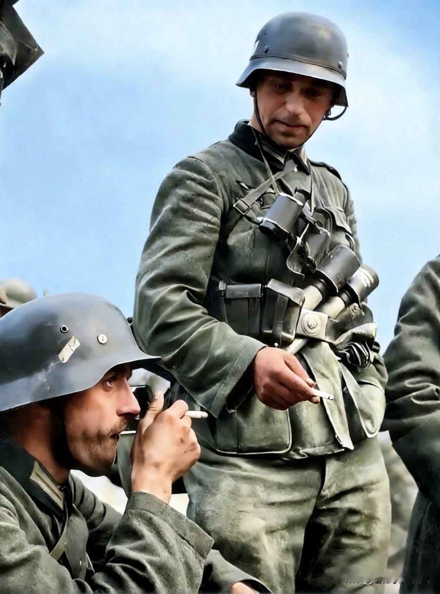 战斗间歇正在吸烟的德军士兵。吸烟可以缓解疲劳和压力。 德军老照片 德军影像 历