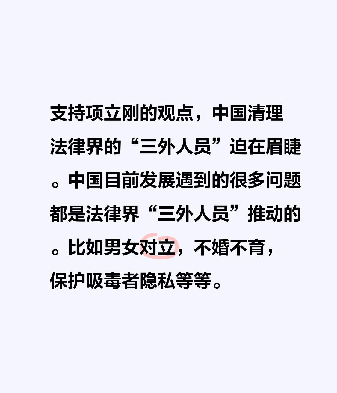 支持项立刚的观点,中国清理法律界的“三外人员”迫在眉睫。 中国目前发展遇到的很多问题都是法律界“三外人员”推动的。比如男女对立,不婚不育,保护吸毒者隐私等等。完全违背社会道德和法律底线。成为中国极少数违法犯罪者的保护伞,完全站在了十四亿人民的对立面!