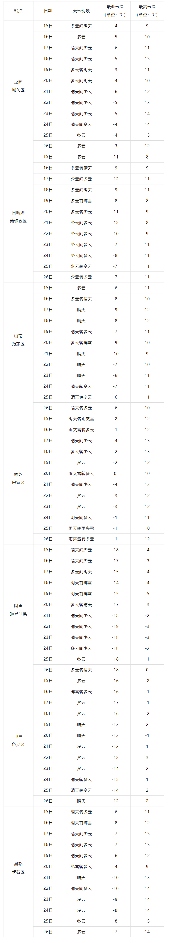大风预报:15日至26日,阿里、那曲、日喀则西部和南部有7级左右大风;拉萨北部、日喀则北部和东部、山南南部和昌都有5级左右阵风。