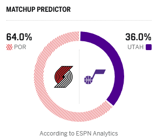 ESPN预测明日比赛:爵士胜率36.0%,开拓者胜率64.0%