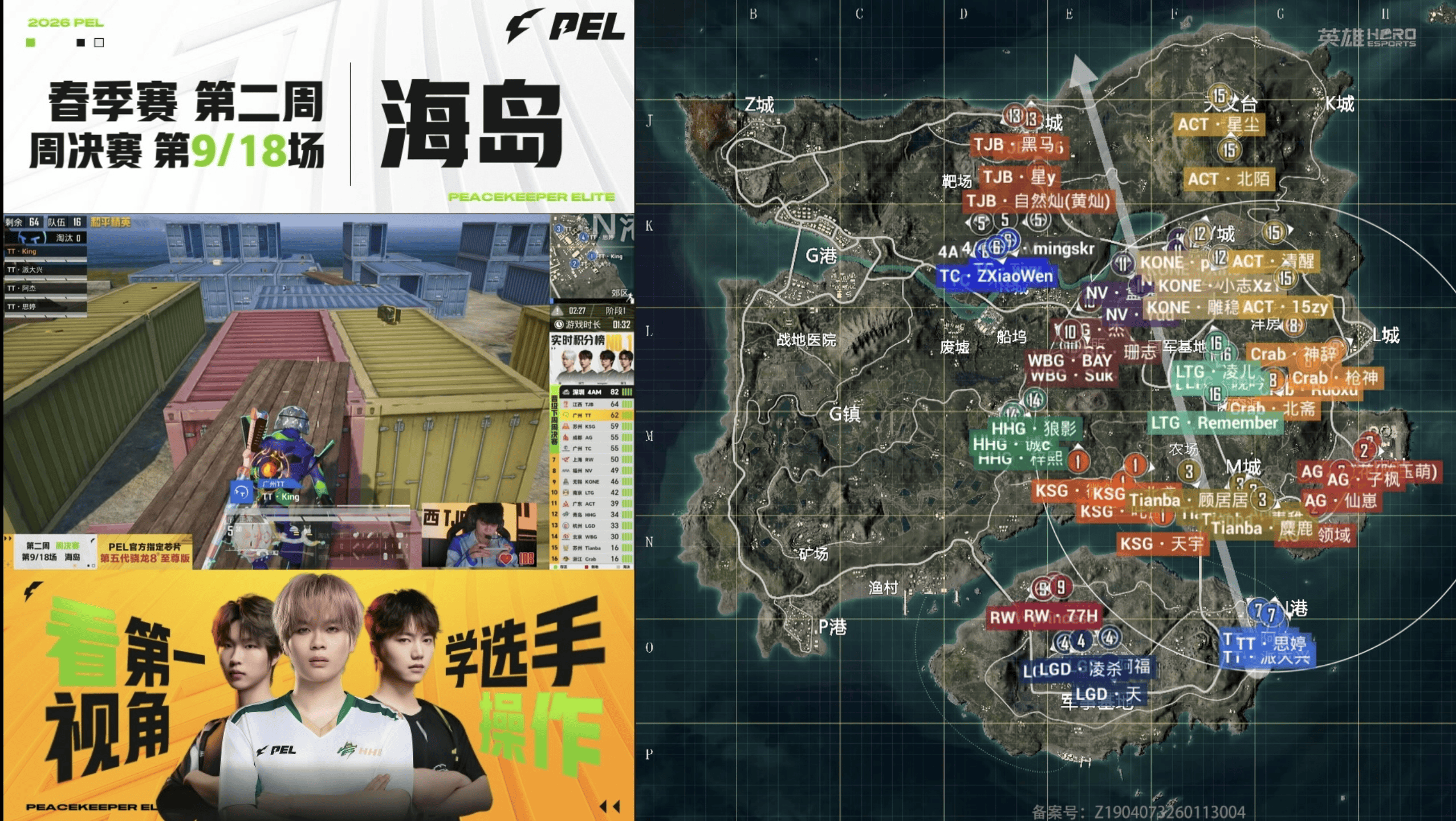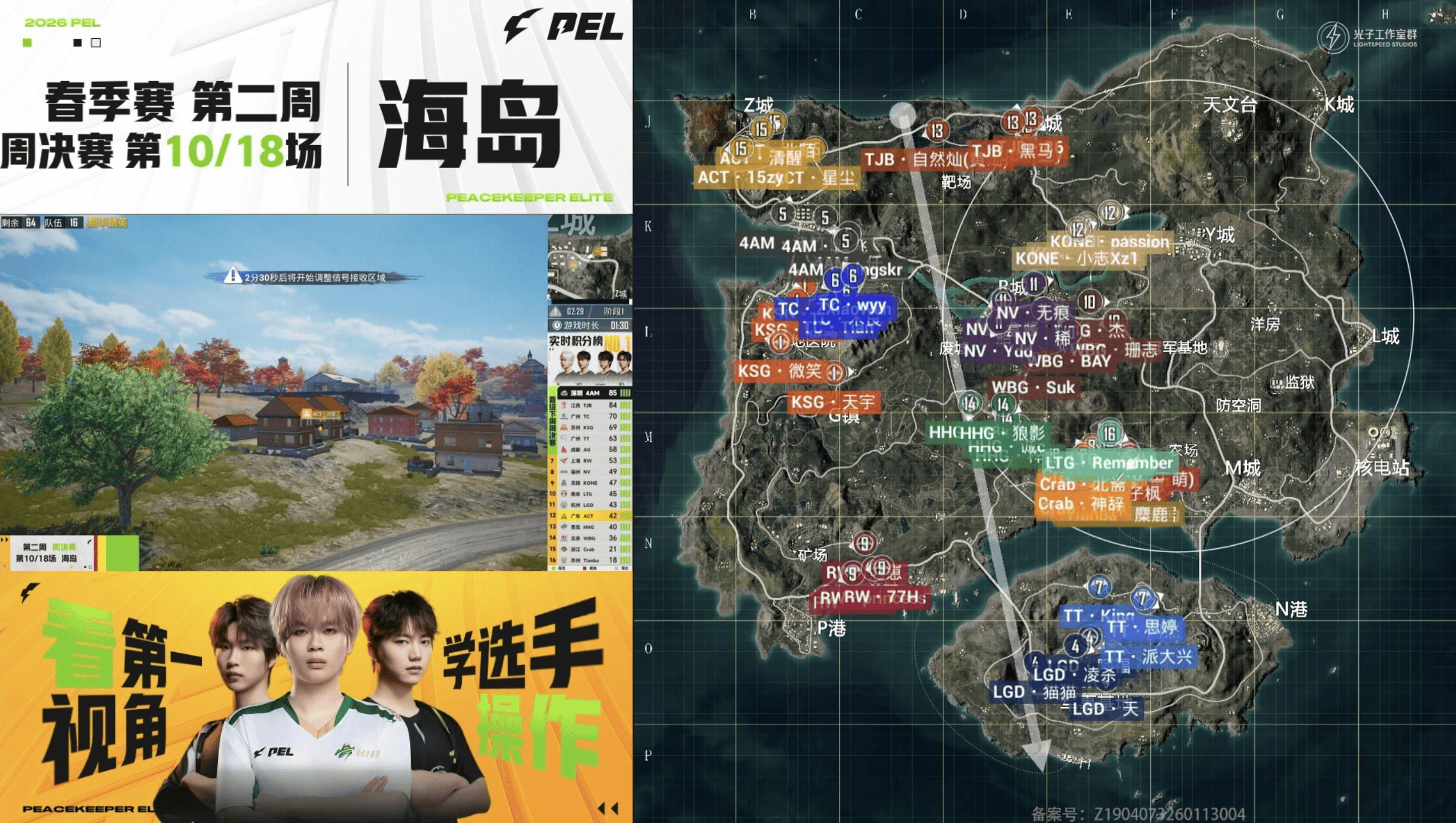 本场比赛航线由普罗港至新山城,首轮缩圈在地图南部。