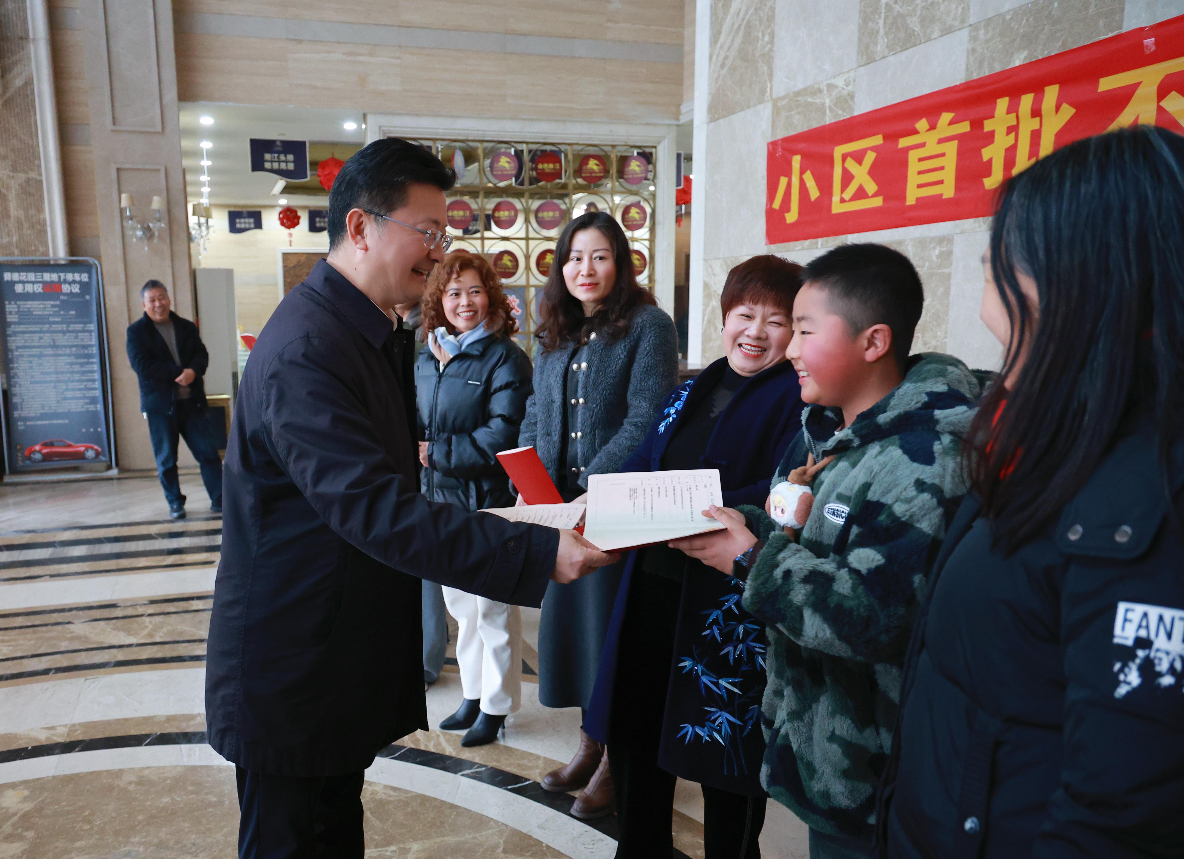 今日永州讯(全媒体记者谢档雷靖)2月12日下午,市委副书记、市长陈爱林为冷水滩区舜德湘江小区业主代表颁发不动产权证书。市委常委、副市长陈卓懿,市政府秘书长齐爱社参加。