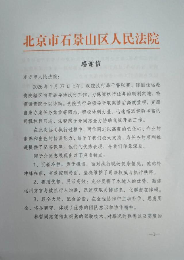 近日,东方市人民法院收到一封来自北京市石景山区人民法院的感谢信,信中对该院在异地执行工作中的全力支持、高效协助致以诚挚谢意,也对该院干警展现出的专业素养与协作精神给予了高度赞扬。