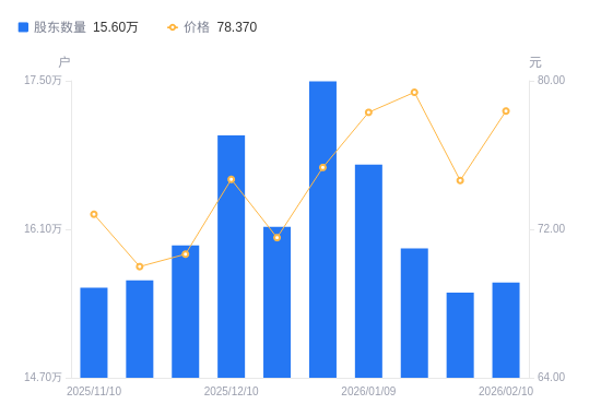 日期A股户数(户)流通A股户均持股数(股)户均持股市值(万元)2026-02-1015598515376.91120.512026-01-3015503215471.43115.462026-01-2015920315066.09119.592026-01-0916710814353.03112.382025-12-3117495513709.28103.272025-12-1916123814711.25105.262025-12-1016986013964.51104.302025-11-2815946914874.44105.102025-11-2015617615188.07106.302025-11-1015548315255.76111.08