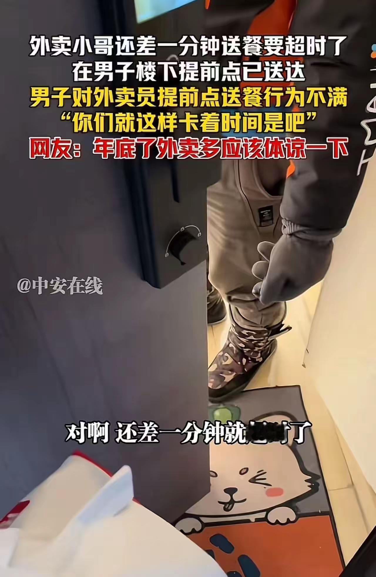 上海,外卖小哥送餐还差一分钟超时,在楼下提前点了送达。点餐男子开门第一句话不是“谢谢”,是质问:“你们就这样卡着时间是呗?” 他大概以为,自己站在“消费者权益”的制高点上,等来的是一个低头认错的骑手。 可他等来的是什么? 外卖小哥愣了一下,随即抬头,不卑不亢: “我没超时吧?我没超时,你凭什么说我?” 就是这句话,让网友炸了。 有人说他“态度恶劣”,有人说他“嘴硬不认错”。可我想问:他错哪儿了? 他没闯红灯,没洒汤汁,没超时。他只是在一分钟前点了送达,而你收到餐的时候,离超时还有30秒。 你损失的,是那30秒的“心理安慰”;他保全的,是一个月3000单里仅有的几个不扣钱的机会。 你只知道他“提前点”,你不知道——只要超时1秒,这单白跑,还要倒扣。 你不知道——为了不超时,他不敢喝水怕上厕所,不敢接家人电话怕耽误那几秒。你不知道——上一个投诉他的顾客,因为他“没把餐送到门口”,理由是“我脚崴了,你不能体谅一下吗?” 体谅。 这个词,好像从来都是单向的。 顾客可以体谅餐厅出餐慢,可以体谅电梯等太久,可以体谅雨天堵车。可唯独对外卖小哥,体谅的额度低得可怜。 因为在他们眼里,你不是一个在路上拼命抢时间的人,你只是一个“点了送达的按钮”。 可那个按钮,不是耍滑头,是他一路闯黄灯、爬楼梯、跑断腿换来的。 我特别理解那个小哥的反应。 他不是第一次被这样质问,也不会是最后一次。以前他可能道过歉、赔过笑脸、被扣过钱还不敢吭声。但那天他不想忍了。 他没超时,凭什么要被审判? 这件事真正让人破防的,不是那30秒,是一个打工人终于敢为自己说一句“我没做错”。 我们总在教服务行业的人“态度要好”“顾客是上帝”。可我们很少告诉顾客:上帝的前提,是人。 是人就会累,会急,会委屈,也会有忍不住回嘴的那一天。 那个小哥不是态度差,他只是在那一刻,不想再跪着了。 有人说,那你别干这行啊。 可这世上,谁不是为了一口饭弯着腰。只不过有人弯成了习惯,有人只想直着说一句实话。 我不是鼓励服务人员跟顾客吵架。我是想说—— 下次你开门接过那一袋热饭,如果没迟到,餐也没洒,能不能先说一句“谢谢”? 因为他没欠你什么。 他只是送饭的人。 不是你出气的人。