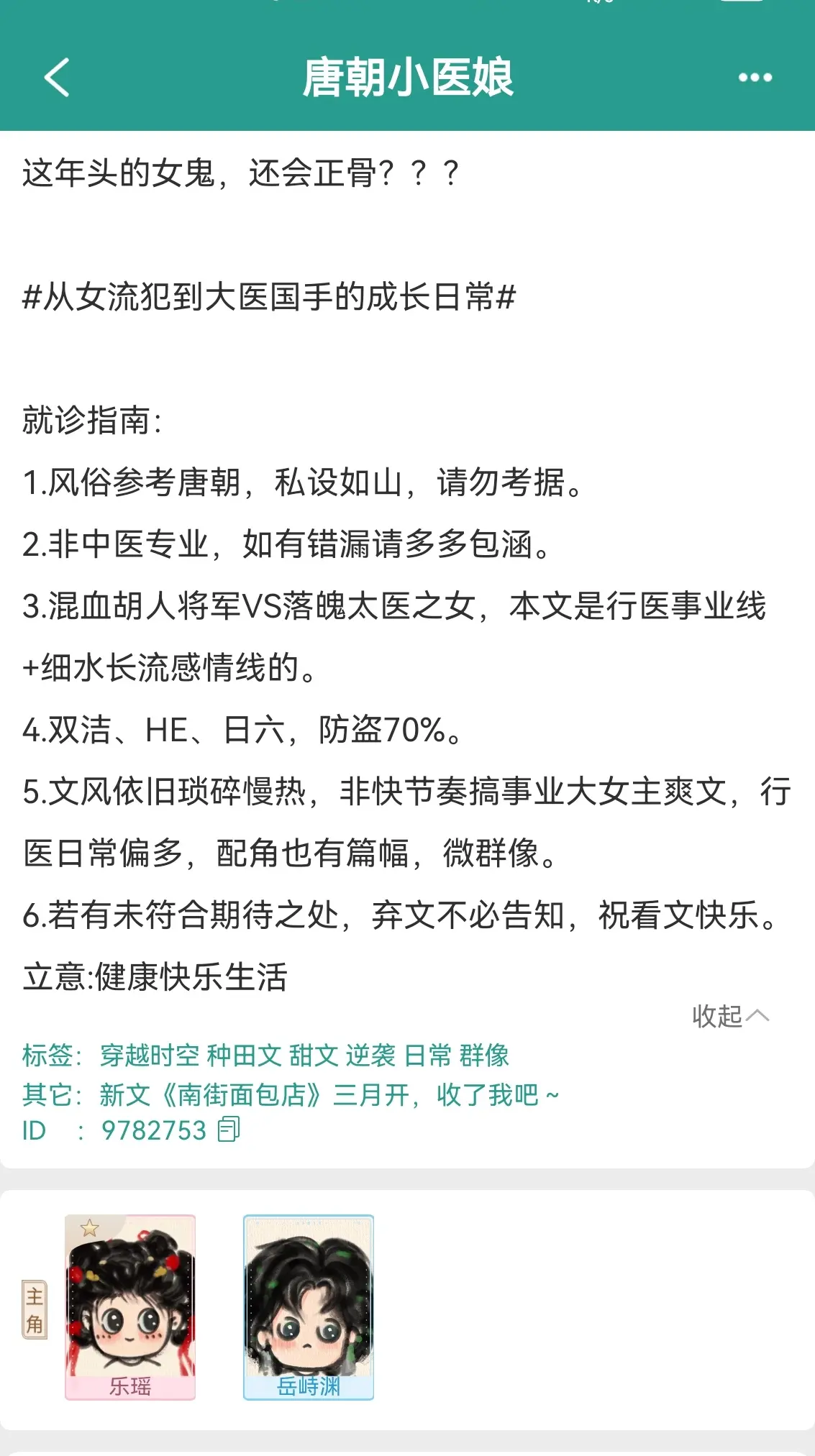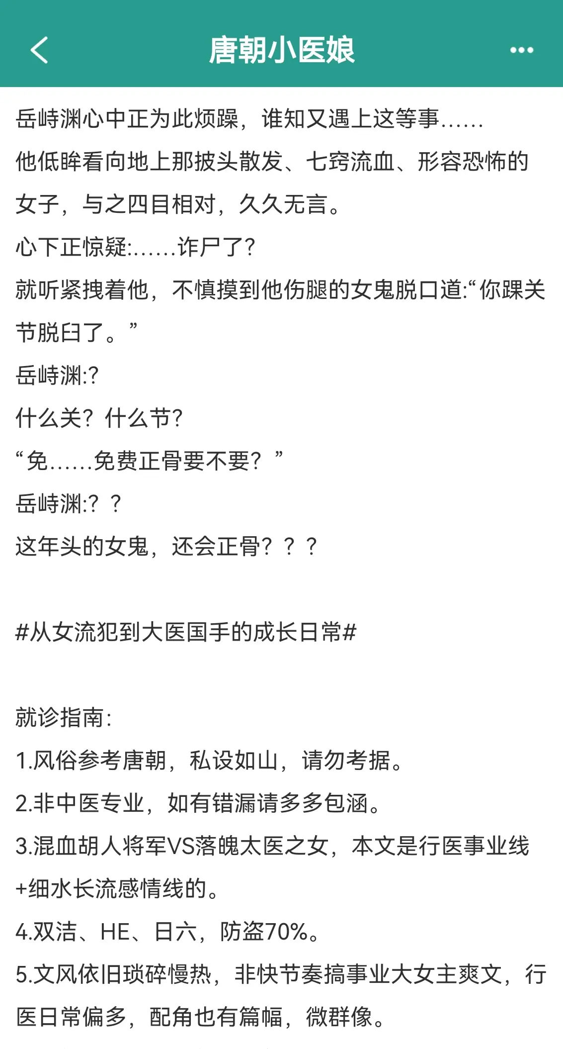 唐朝小医娘。作者PS: 就诊指南: 1.风俗参考唐朝,私设如山,请勿考据。 2.非中医专业,如有错漏请多多包涵。 3.混血胡人将军VS落魄太医之女,本文是行医事业线 +细水长流感情线的。 4.双洁、HE、日六,防盗70%。 5.文风依旧琐碎慢热,非快节奏搞事业大女主爽文,行 医日常偏多,配角也有篇幅,微群像。 6.若有未符合期待之处,弃文不必告知,祝看文快乐。 立意:健康快乐生活 穿越时空 种田文 甜文 逆袭 日常 群像